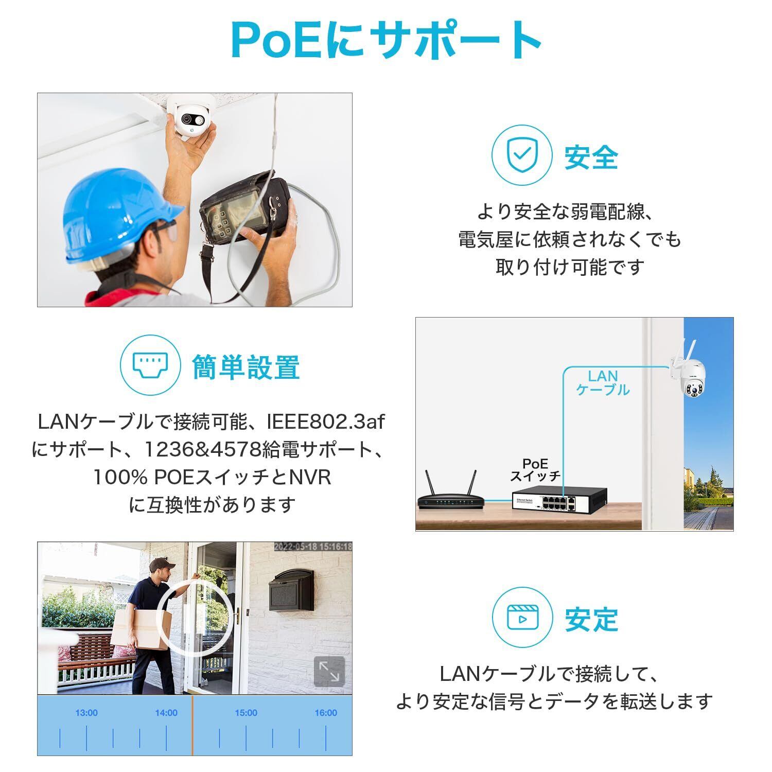 【POE給電】POEカメラは設置場所によって、2種類給電モードをサポートします。1.POE給電:スイッチングハブを使用して、NVRとコンセント不要 CAT5ネットケーブル一本で直接電源とネットワークを接続できます。コンセント無くでも、取り付け可能です。最大200メートルサポート可能です。2.DC給電:電源アタプター使用して通常な給電モードもサポートします。(スイッチングハブ別売:B0BKPY6WC5)録画保存:24時間常時録画、スケジュール録画、動体検知録画3つ録画モードを設定できます。超ビデオ圧縮技術により、低容量でも高画質をみることができます。16/32/64/128GBのマイクロカードをサポートします。