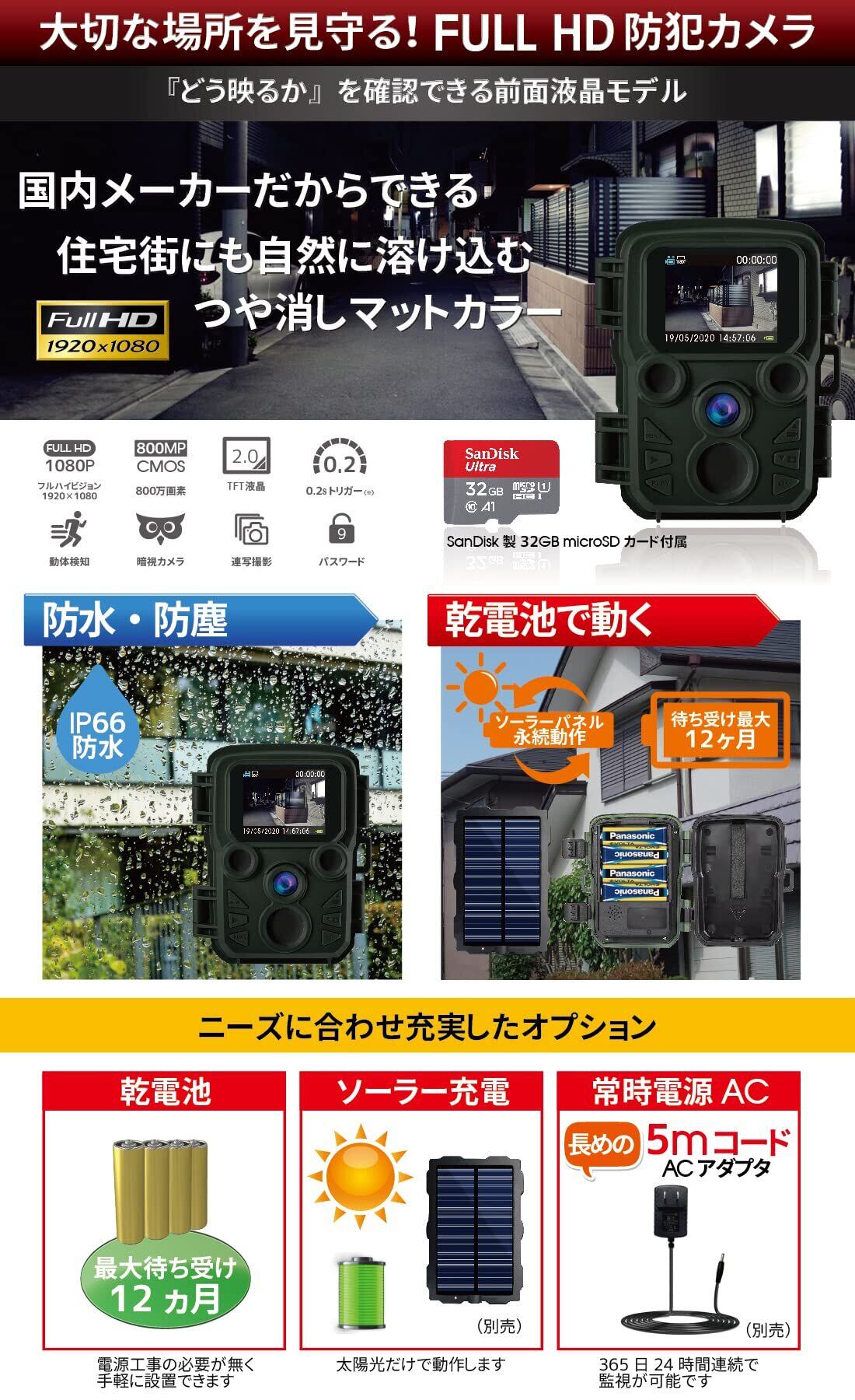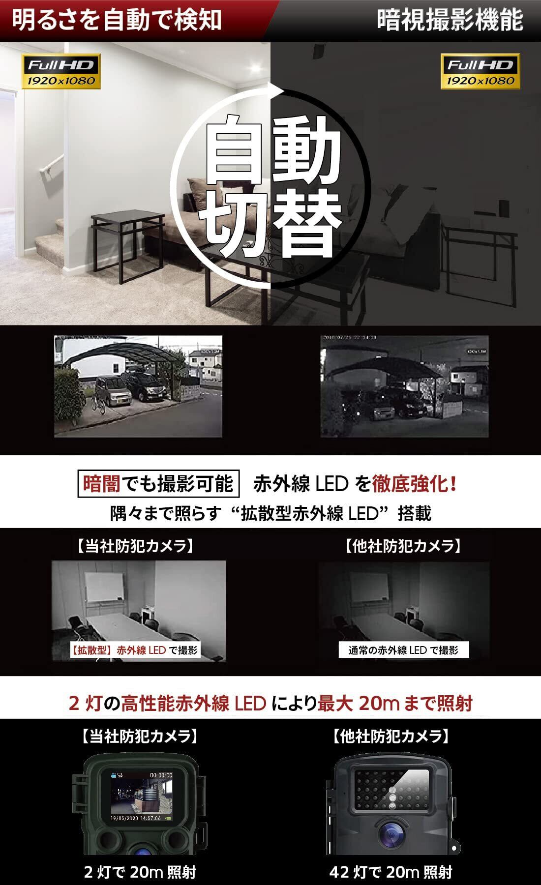 PIRセンサー(人感センサー)を搭載、最長20mまでの検知に対応。/ 暗視機能: 2灯 高品位赤外線LEDで最長20mまで照射 / 防水・防塵対応: 防犯カメラとして最高水準の防水・防塵規格『IP66』に対応