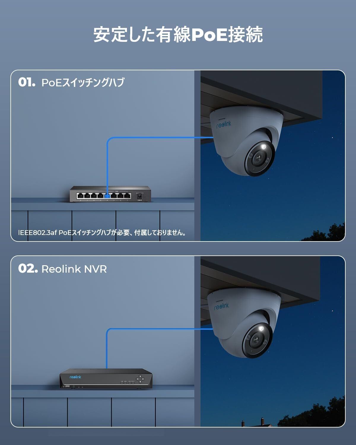 簡単なPoE設定: PoE技術により、この屋外用見守りカメラは、ネットワークケーブル1本だけで映像の送信と電源の供給が同時的に実現できます。数分間だけに設置が完了でき、信頼性の高い接続を実現します。【ご注意:DCアダプタやPoEハブは別売りです。ご需要に応じて、別途用意してください。】