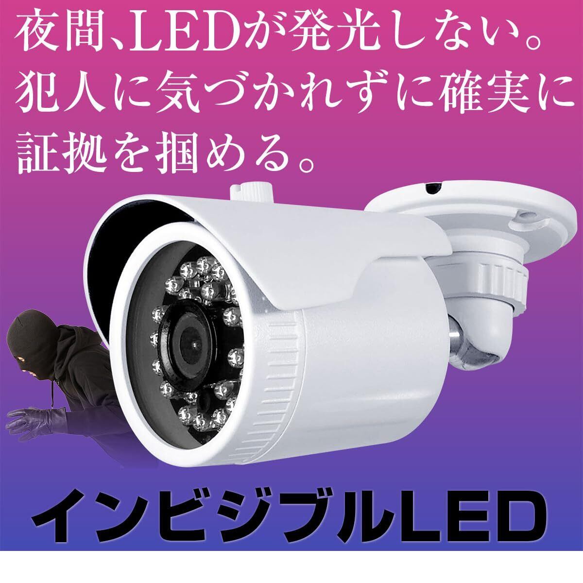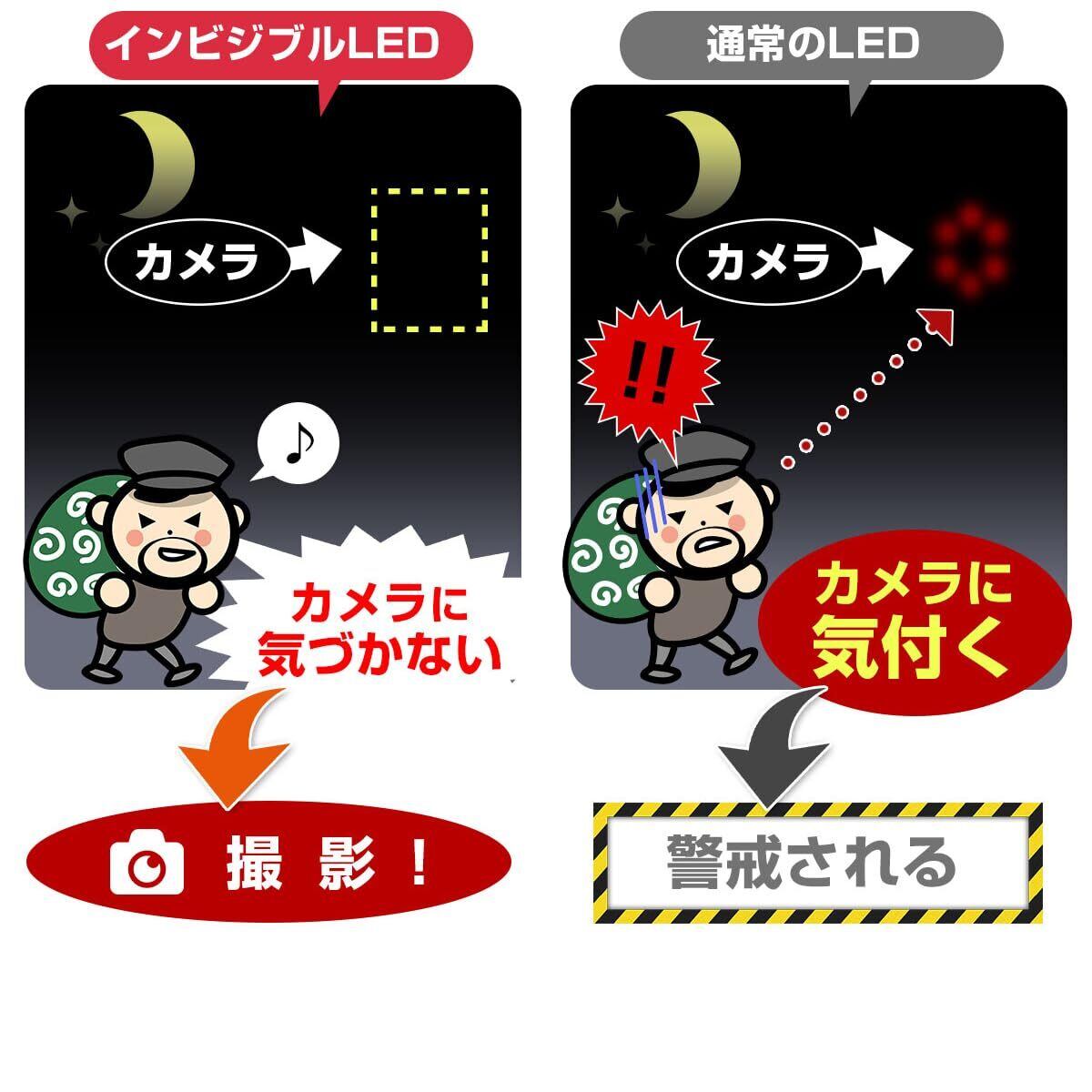 肉眼では見ることのできない不可視赤外線LED(940nmインビジブルLED)を採用。実際には夜間に赤外線LEDを発光して赤外線暗視撮影をおこないますが、赤外線の発光は肉眼で見ることのできませんので、犯人に気づかれることなく証拠を撮影することができます。