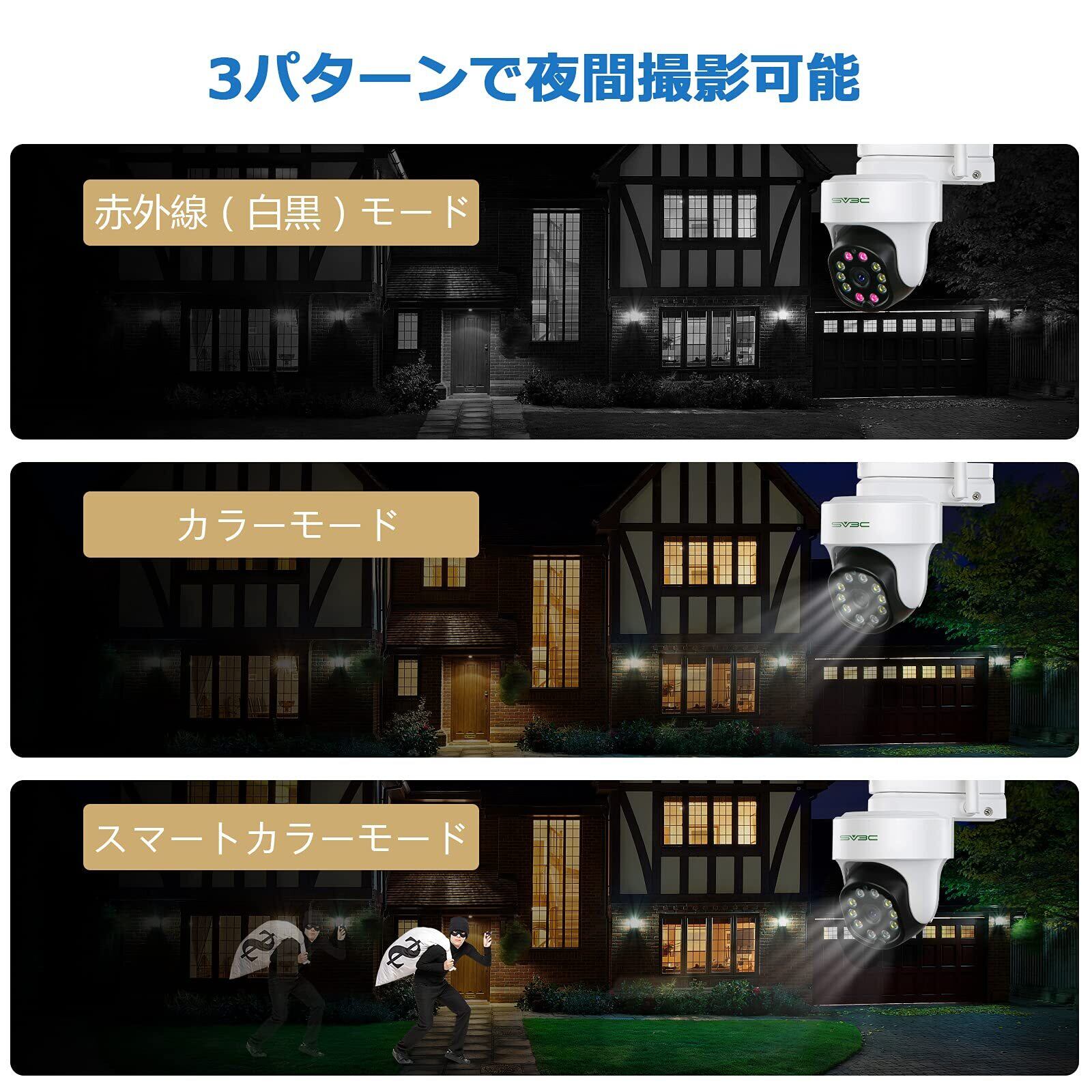 <機能>内蔵されたLEDにより、夜間のカラー撮影が出来ます。防犯カメラを目立たせたくない場合は、赤外線白黒撮影モードを設定することも可能です。 スマート暗視モードを使用すれば、人や動きを検知すると、カラー暗視モードに切り替わり、LEDセンサーライトが自動点灯します。これにより、不審者を威嚇する犯罪効果が期待できます。