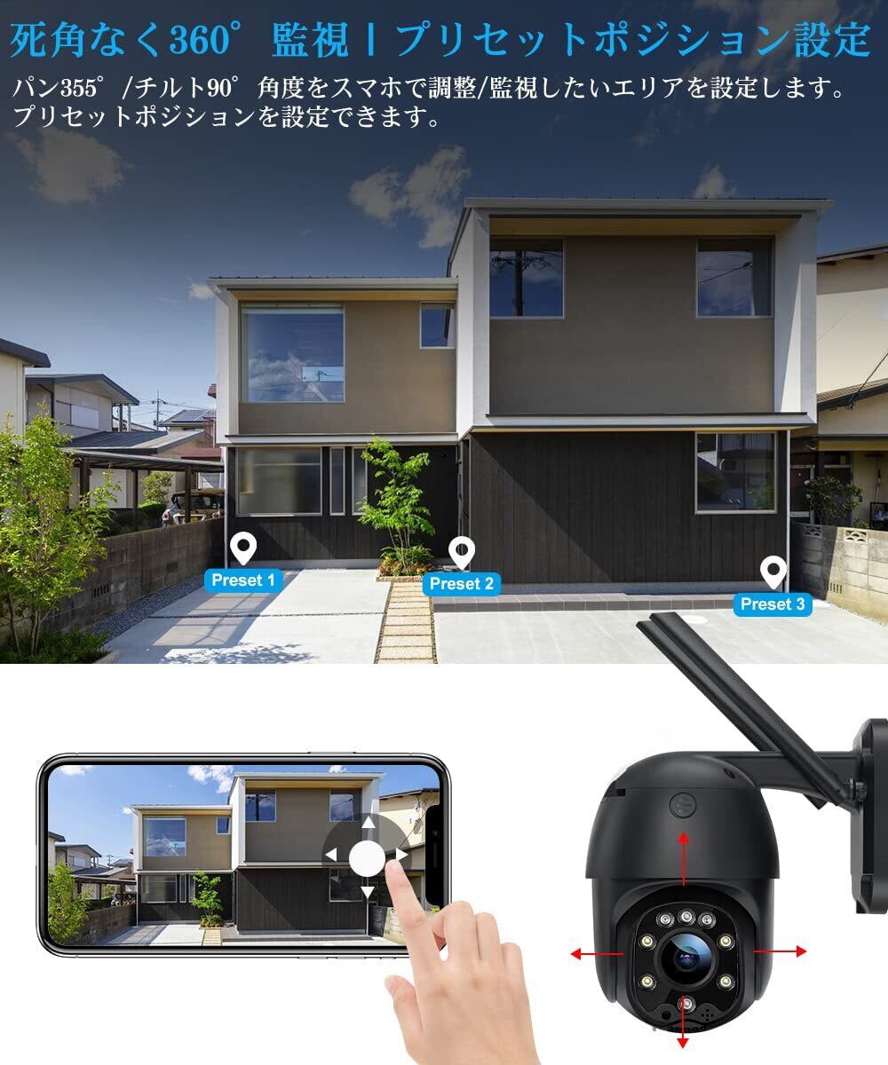 【 360°死角なく監視可能・自動追跡機能】小型ながら左右355°と上下90°のパンチルト機能を搭載し、360°死角なく周囲を監視するptzカメラです。首振り機能により16位までのプリセット位置を設定できます。そして、スマホ経由でカメラの角度を自由に調整し、監視したい角度とエリアを確認・設定できます。更にこの屋外防犯カメラは自動追跡機能付きで、不審者を検知すると首を振りながら追跡できるワイヤレス防犯カメラです。この屋外防犯カメラは自動追尾してから、先に設定した場所へ戻ることが可能です。詳しい設定方法についてお気軽に問い合わせしてください。