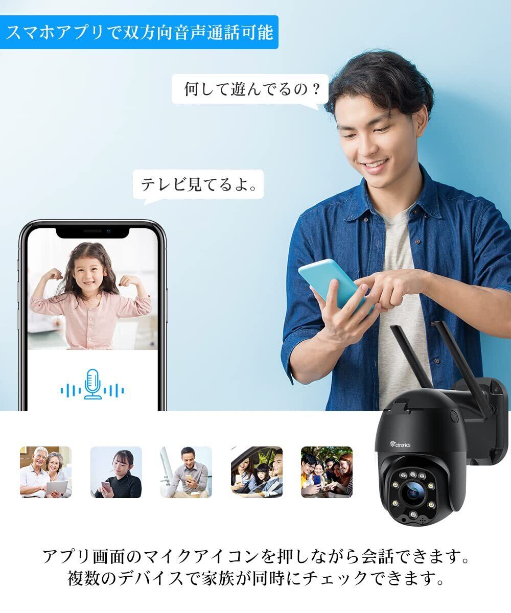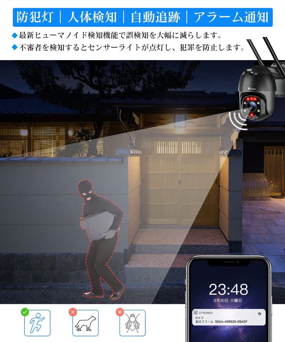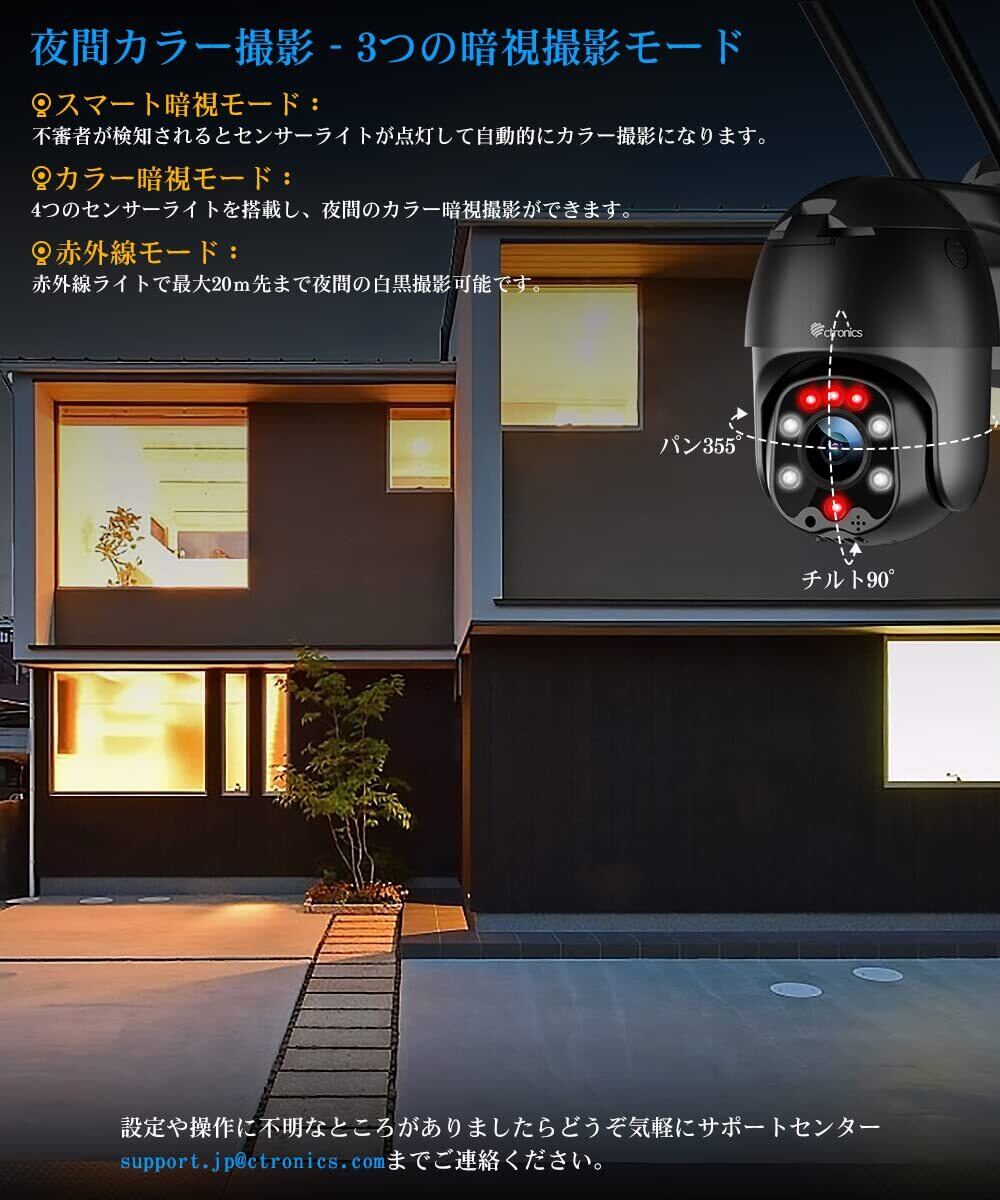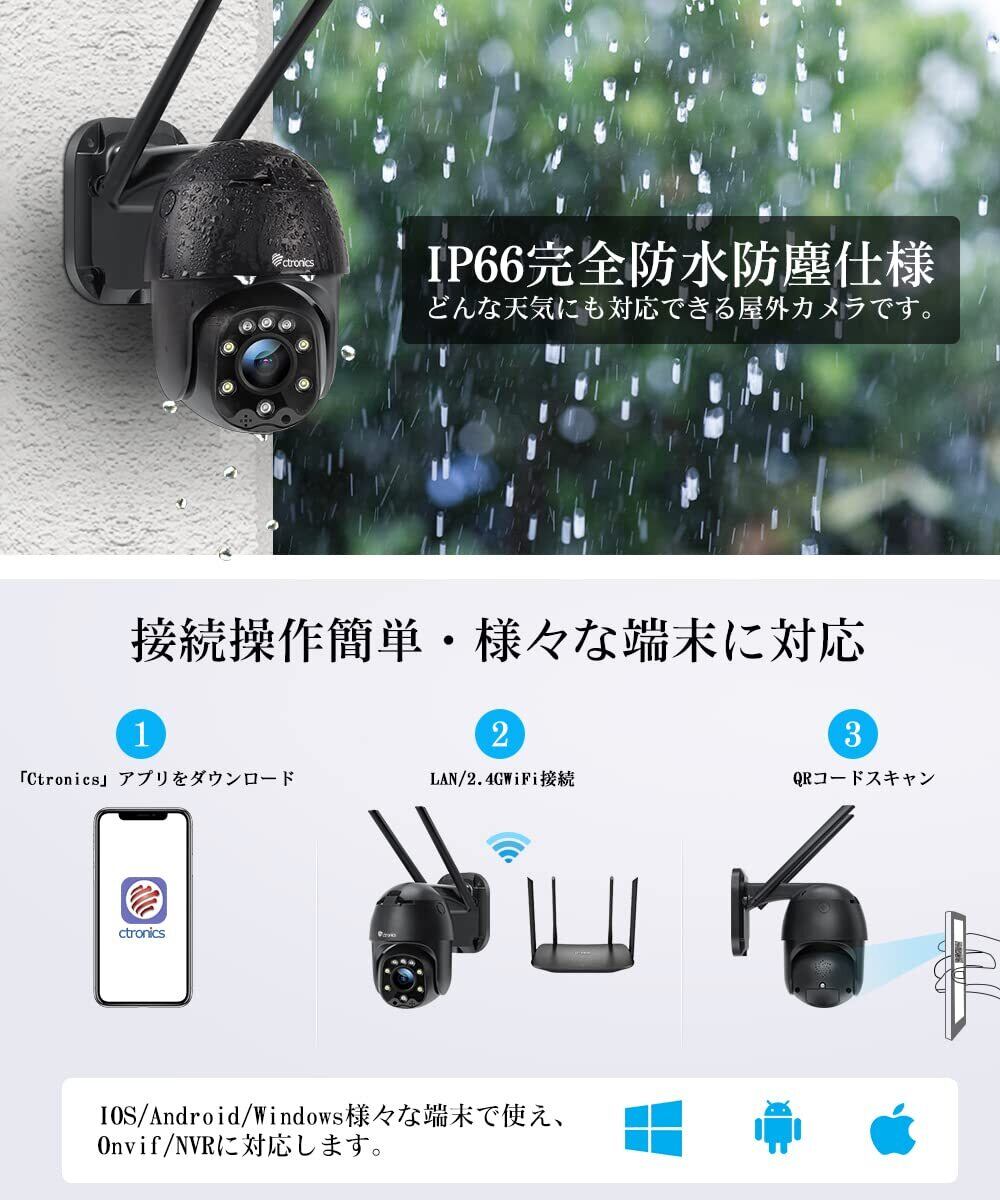 Ctronics 防犯カメラ 屋外 360°監視 自動追尾 WiFi ナイトカラー ヒューマン検知 FHD1080P スマホ連動 センサーライト搭載 24時間録画 家族共有 遠隔操作 モーション検知 常時録画 360°監視カメラ パンチルト ptzカメラ 双方向音声会話 遠隔操作 iOS/Android/Windows/Mac対応 IP66防水防塵 防犯ステッカー付