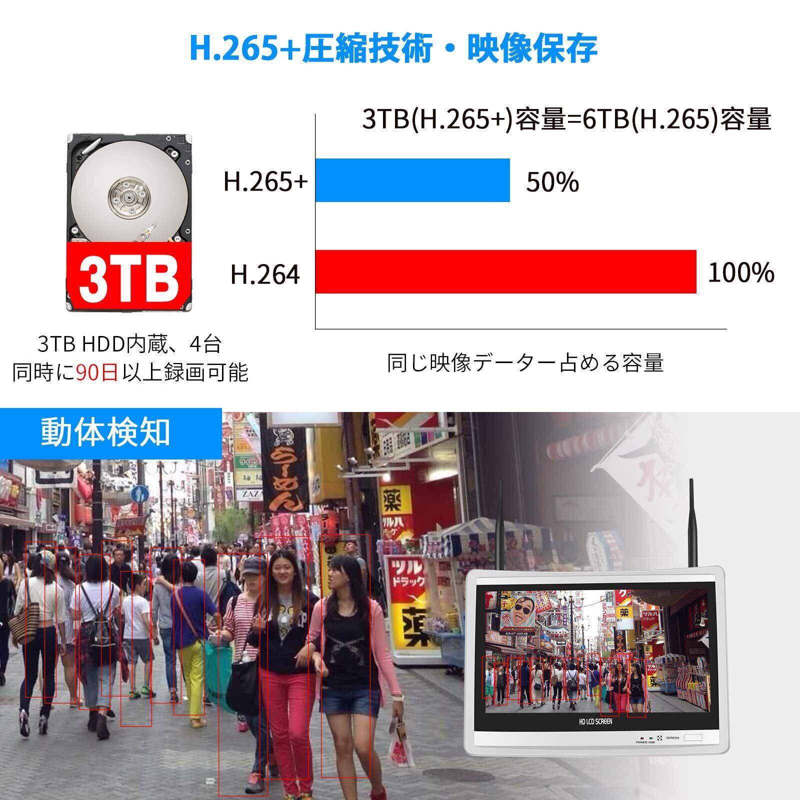 【H265+24時間90日の録画可能】無線自動ペアリングで複雑な設定が不要です。H.265高圧縮モデルを採用し、H.264より 2 倍以上のハードディスク容量を節約します3TBハードディスクを内蔵し24時間90日以上の録画が可能です。録画データが満了になると自動的に古いデータから上書きします。(設置前にカメラシステムをテストしてください)