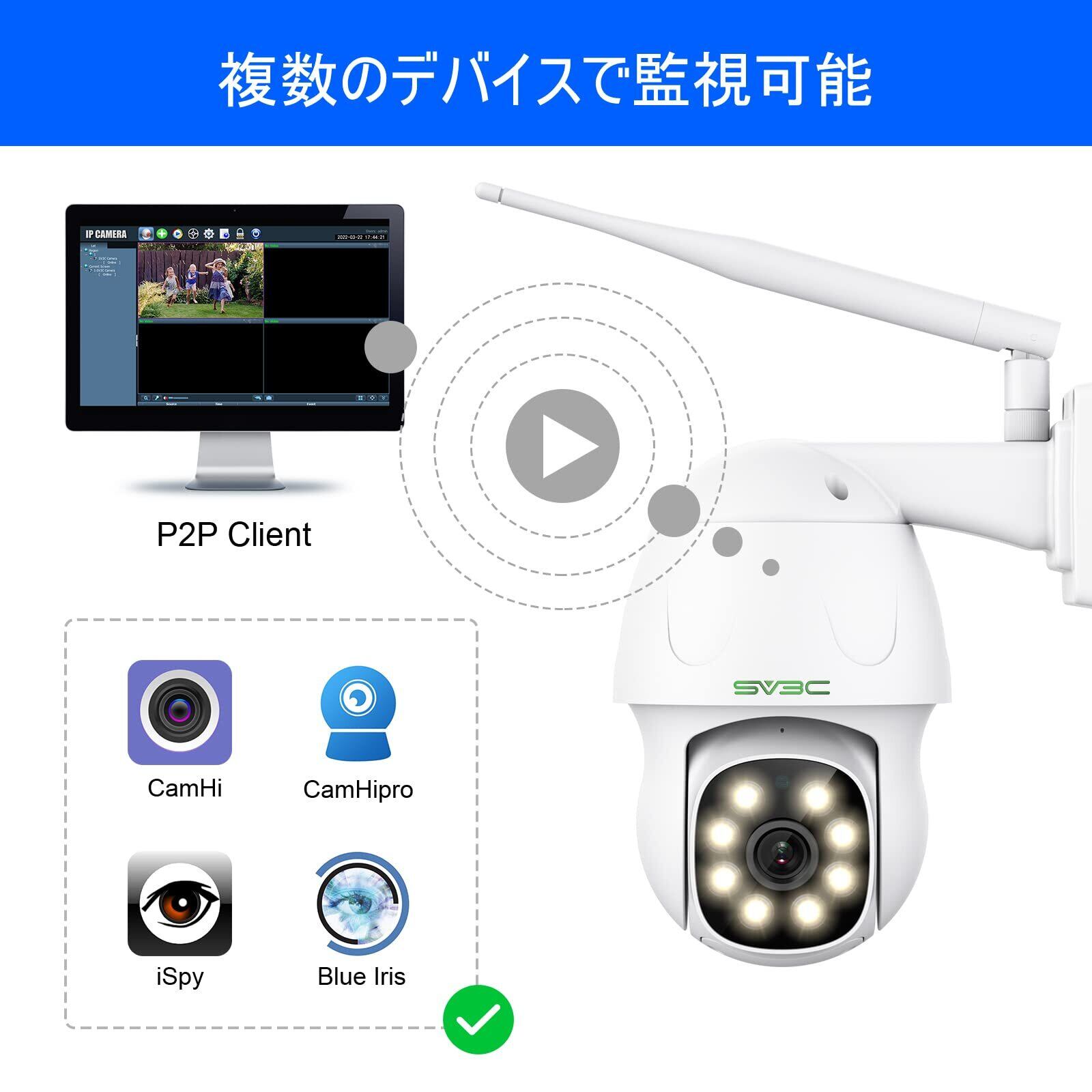 SV3C 防犯カメラ 屋外 ワイヤレス 500万画素 2.4/5G対応 パンチルト ptzカメラ 夜間カラー撮影 自動追跡 動体検知 人体検知 スマホ通知 双方向音声 パソコン対応 ios android windows対応
