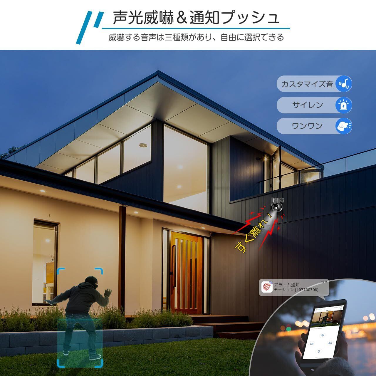センサーライトを搭載して夜間もカラー撮影でき、真っ暗夜間でも鮮明に映ります。不審者を検知すると声光で威嚇します。(威嚇音は3種類あり、警報音、犬のなき声とカスタム)通常、不審者を検知してから記録を開始しますが、こちらの監視カメラは不審者を検知する0.5秒前から録画を開始しますので、より確実に不審者を捉えられ、そのキャプチャをFTPに保存できます。