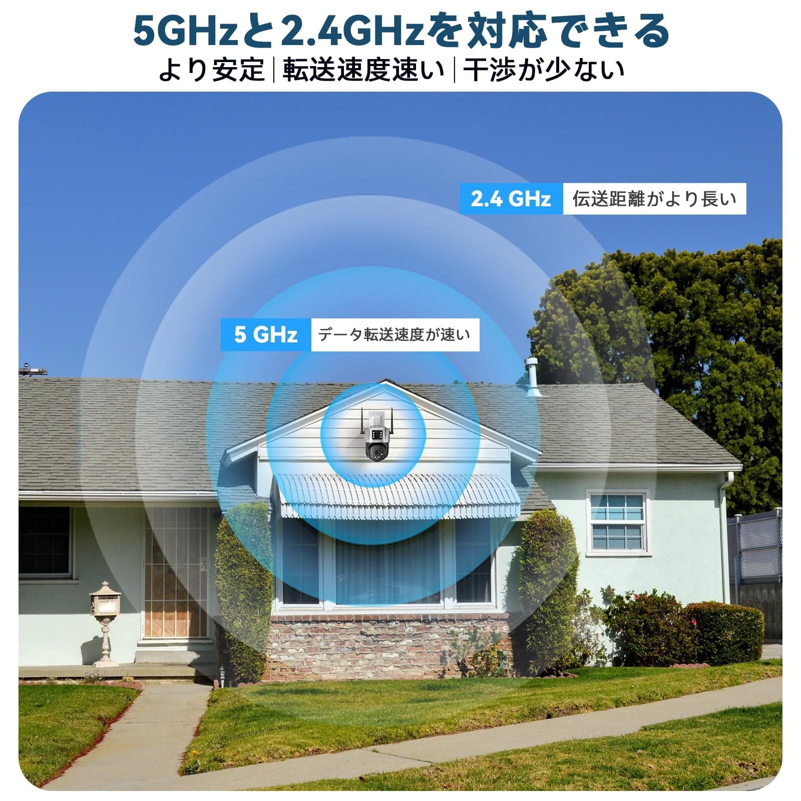 【より安定した5GhzWi-Fi】2.4Ghzwifiだけでなく、5Ghz帯にも対応します。2.4GHzより電波干渉にも強くて安定的に、高速な通信が可能です。 さらに360度スマホまたはPCから遠隔制御できプリセット位置も8箇所も設定できます。 家にいなくてもスマホで防犯カメラの操作ができるため家の周りが確認できて安心です。