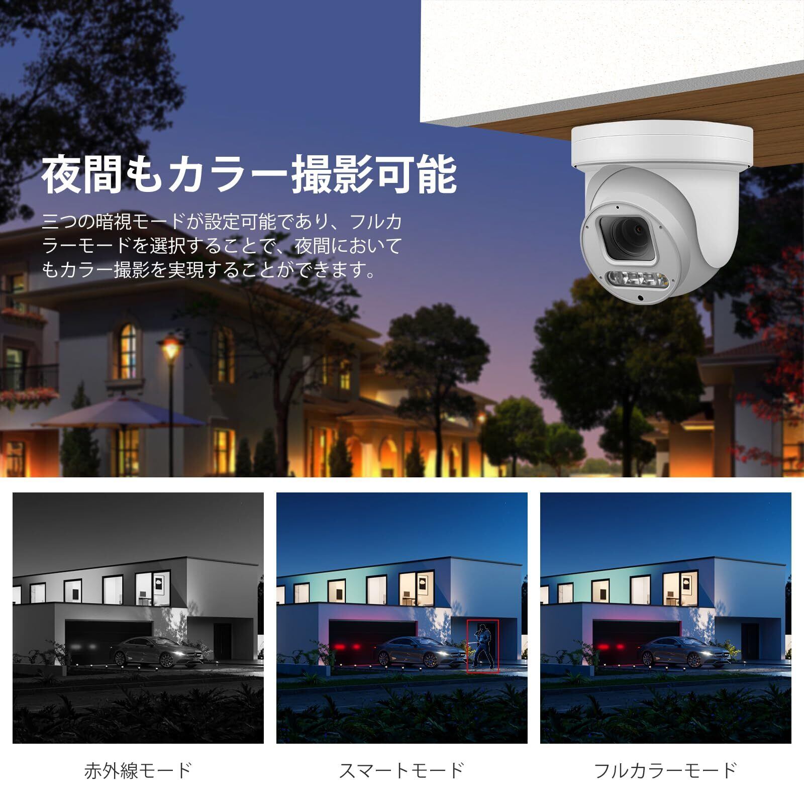 50メートルのスマートカラーナイトビジョン:夜間にPoE PTZカメラが人物または車両を検出すると、LEDホワイトライトが自動的に点灯し、映像は白黒からカラーに切り替わります。選択できる3つのナイトビジョンモードがあり、スマートカラーナイトビジョン、フルカラー、赤外線があります。これにより、夜間でも鮮明で詳細な映像を確保し、セキュリティ対策を向上させることができます。(スマートカラーナイトビジョンモードは手動で無効にすることも可能です。)