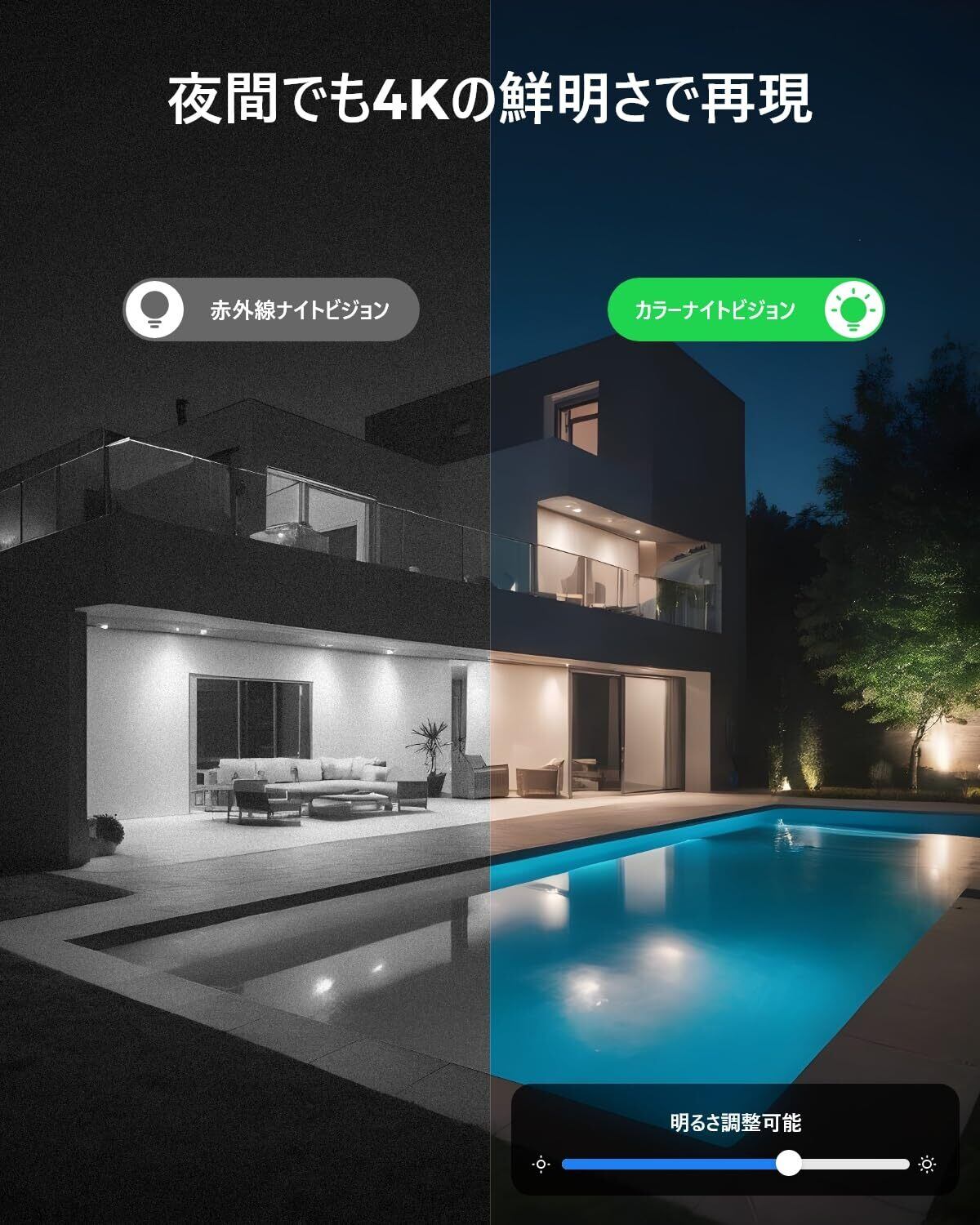 4K UHDビューと2つのナイトビジョンモード:この防犯カメラで息をのむような4K 8MPウルトラHDビューをお楽しみください。低照度条件下でも、鮮やかな色のディテールをお楽しみください。赤外線ナイトビジョンモードに切り替えると、最大60メートルの距離からでも鮮明な映像を映し出します。