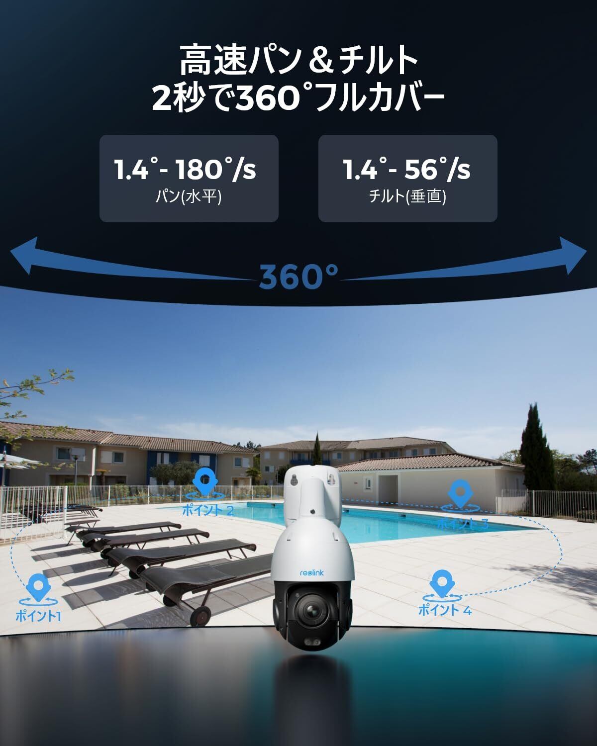 Reolink 防犯カメラ PoE給電 4K 800万画素 5倍光学ズーム PTZ首振り 360度全方位 自動追尾と復帰 パトロール機能 IPカメラ AI人/車両/動物検知 有線接続 屋外監視カメラ センサーライト付き 声光威嚇 夜間カラー撮影 24時間常時録画 遠隔監視 スマホ/PC対応 双方向会話 SDカード録画/Reolink NVR保存 RLC-823S1