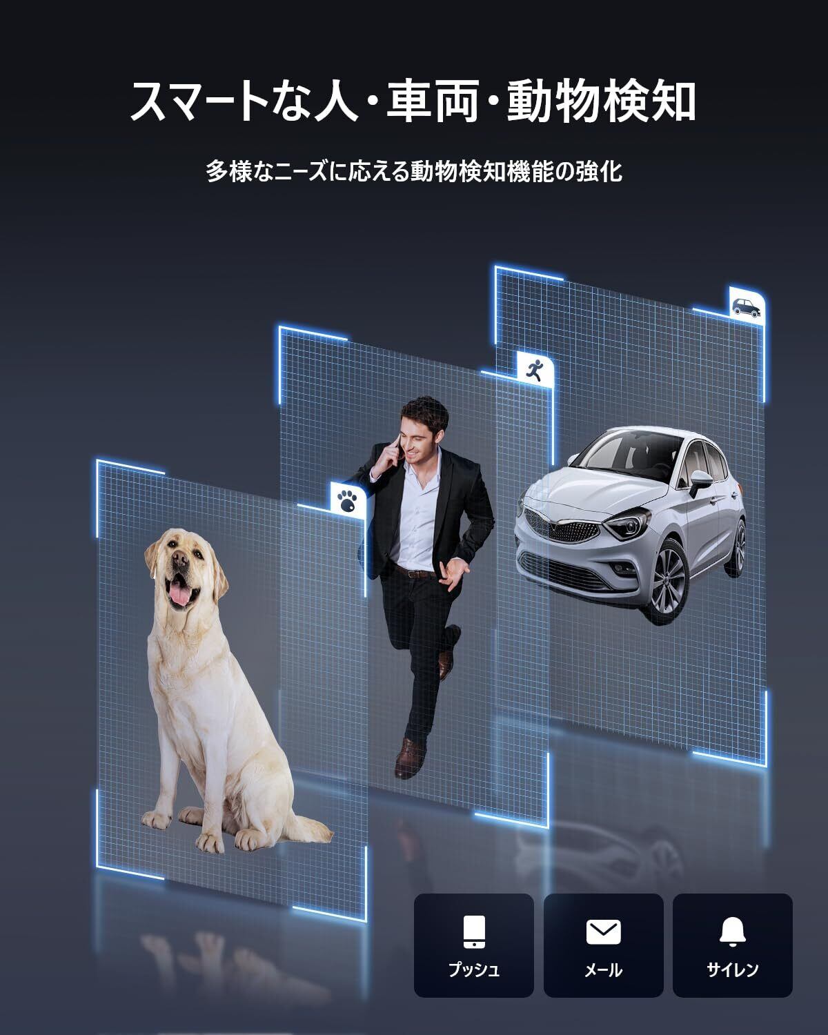 スマート検知&双方向会話: 人/車の動きを正確に検知し、誤報を減らします。私たちの高度な動物検出は、猫/犬を超えて拡張し、動物の広い範囲を検出します。双方向オーディオでカメラ側の人と簡単に会話ができます。