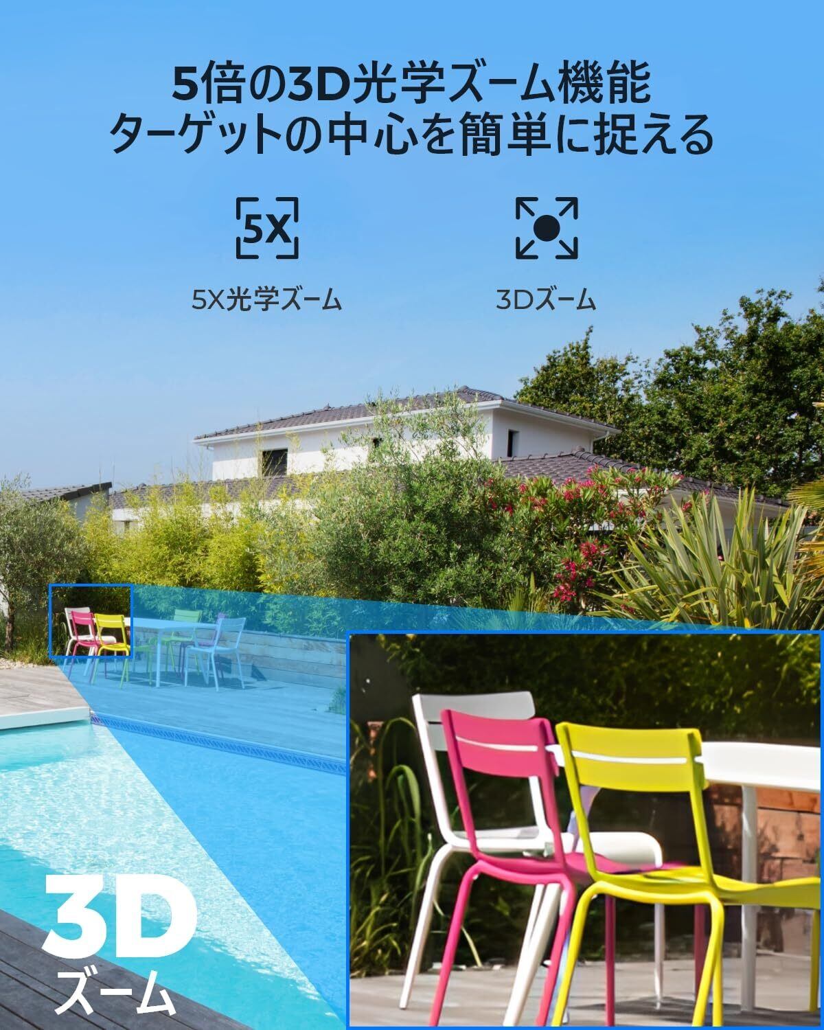 5X 3D 光学ズーム機能:3Dズーム機能でライブビュー体験を合理化し、何度もクリックすることなく特定のエリアに即座に焦点を合わせることができます。スクリーンの中心にターゲットを捉えることができます。