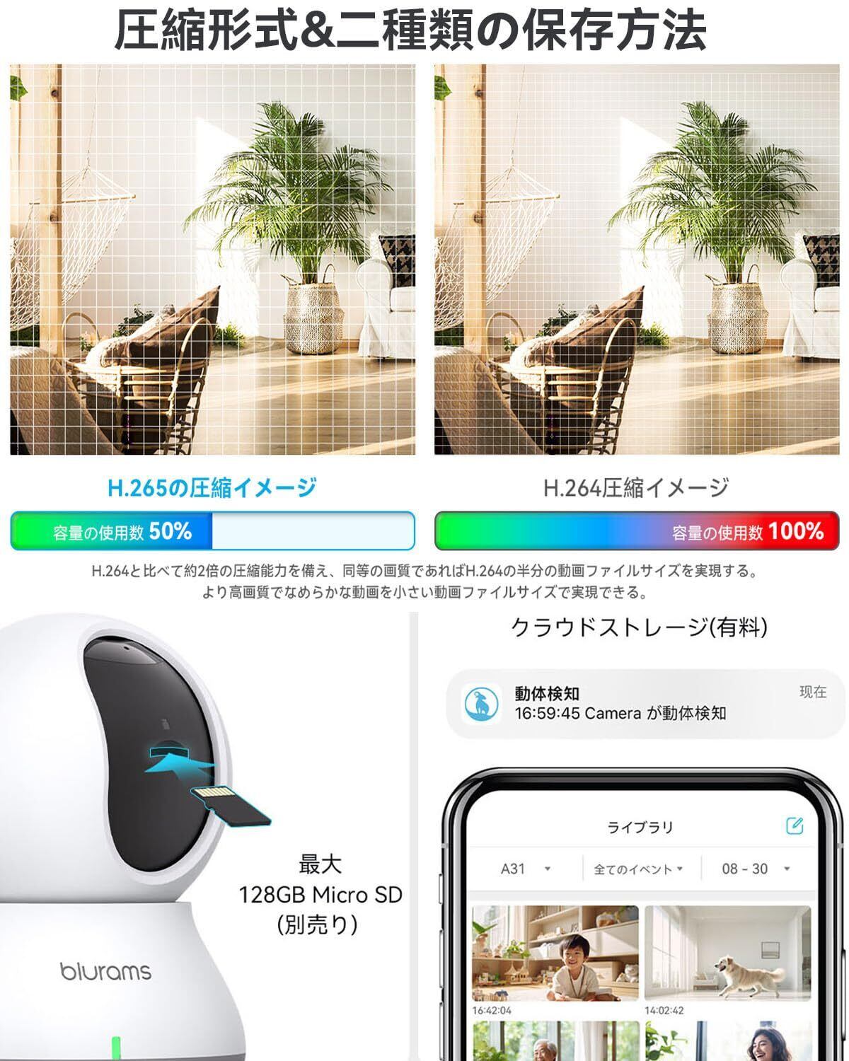 2.4と5GhzWiFi対応・ご家族やペットを見守る:①水平方向360°、垂直方向110°のPTZ機能を付きます。「blurams」アプリで遠隔から向きを操作できます。4倍デジタルズームを搭載して、必要に応じてズームアップして細部を確認できます。②アプリのリアルタイムで音声双方向通話も可能です。お子様の見守り用・猫や犬の監視用・お年寄りの介護用やオフィス用など様々なシーンで大活躍です。③microSDカードで24時間録画可能です。(無料、最大128GB、microSDカードは含まれていません。)
