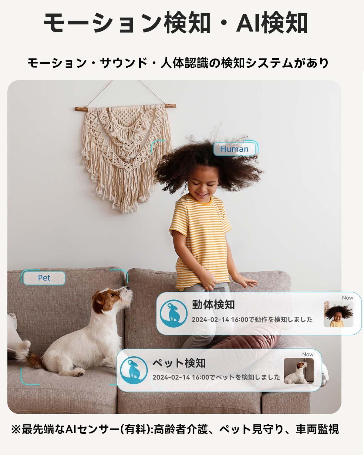 モーション自動追尾・警報通知・暗視機能:①モーション、サウンド、人体認識の検知システムがあります。アプリで「自動追跡」をオンにすると、動きによって水平・垂直に見回りして自動追跡できます。アプリで「通知権限」をオンにすると、スマホから警報通知が届けます。②先端なAIセンサー(有償)が搭載され、高齢者介護、ペット見守り、車両監視もあります。③6*850 nm赤外線LEDが採用され、暗視距離7m以内です。明るい場所ではカラー映像で、暗い場所ではモノクロ映像に切り替わります。