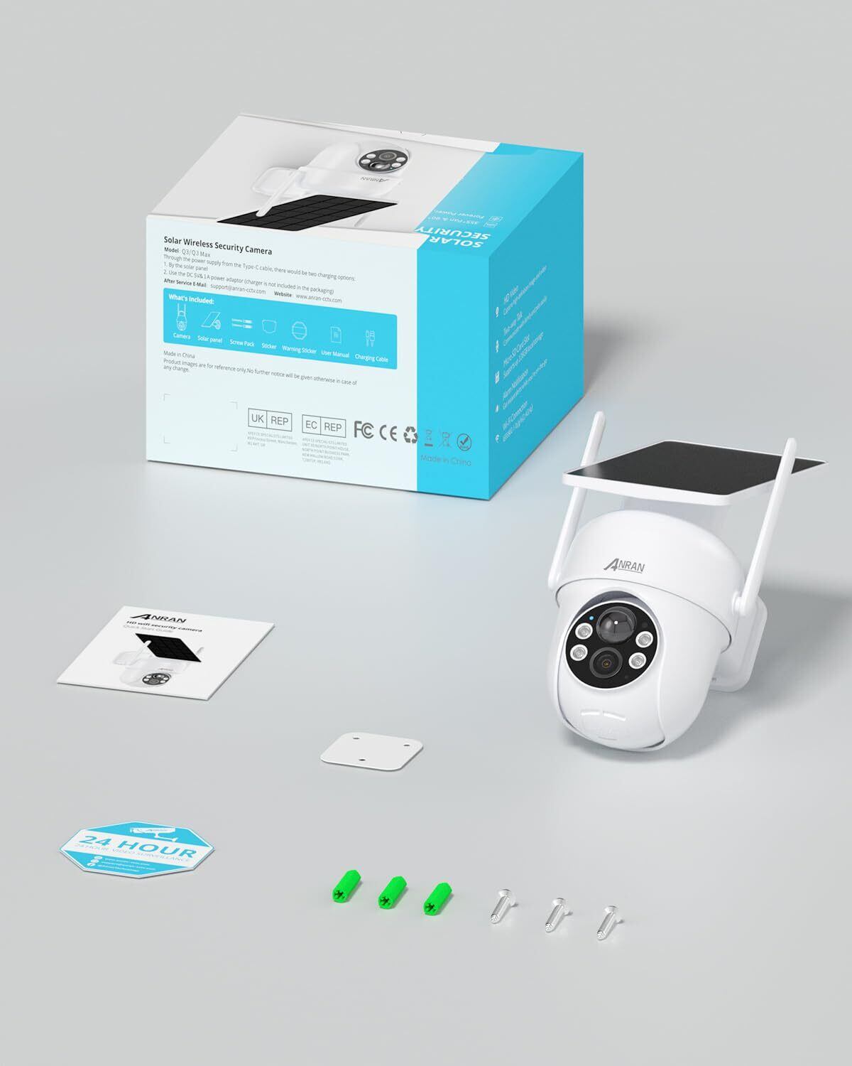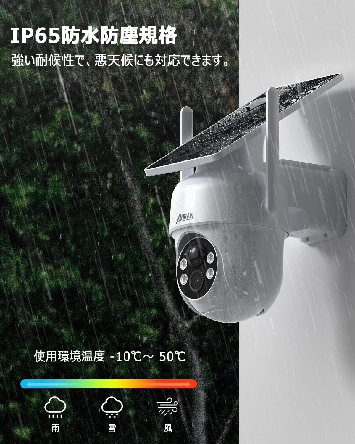 【500万超高画素・360度全方位監視】ANRANソーラー監視カメラは500万画素(2592*1944)解像度映像、従来1536pより鮮明な画面を送り、更に4倍デジタルズーム機能で細かい所まで監視できます。防犯カメラの画角は130°、PTZ制御してレンズの向きを水平(パン)355°垂直(チルト)120°に調整できます。ソーラーパネルは角度の調整も可能で、屋外に取り付けても、電源の確保の心配不要、配線工事に困る必要がありません。初めて設定する際は、カメラの電力はあまり足りないので、充電器でフル充電してからソーラーパネルでカメラに接続することをお勧めします。 充電ケーブルを差すとき、まずは防水のゴムパッキンを外してから充電ポートに接続してください。ライトが点灯出来るかどうかご確認ください。本防犯カメラはソーラー一体型カメラなので、別途ソーラーパネルが付属しておりません、別途ソーラーパネルが必要な場合はご自身で購入する必要があります。このカメラはソーラーパネル一体型機なので、遮光環境に設置すると、カメラを太陽エネルギーで充電できなくなりますのでご注意ください。