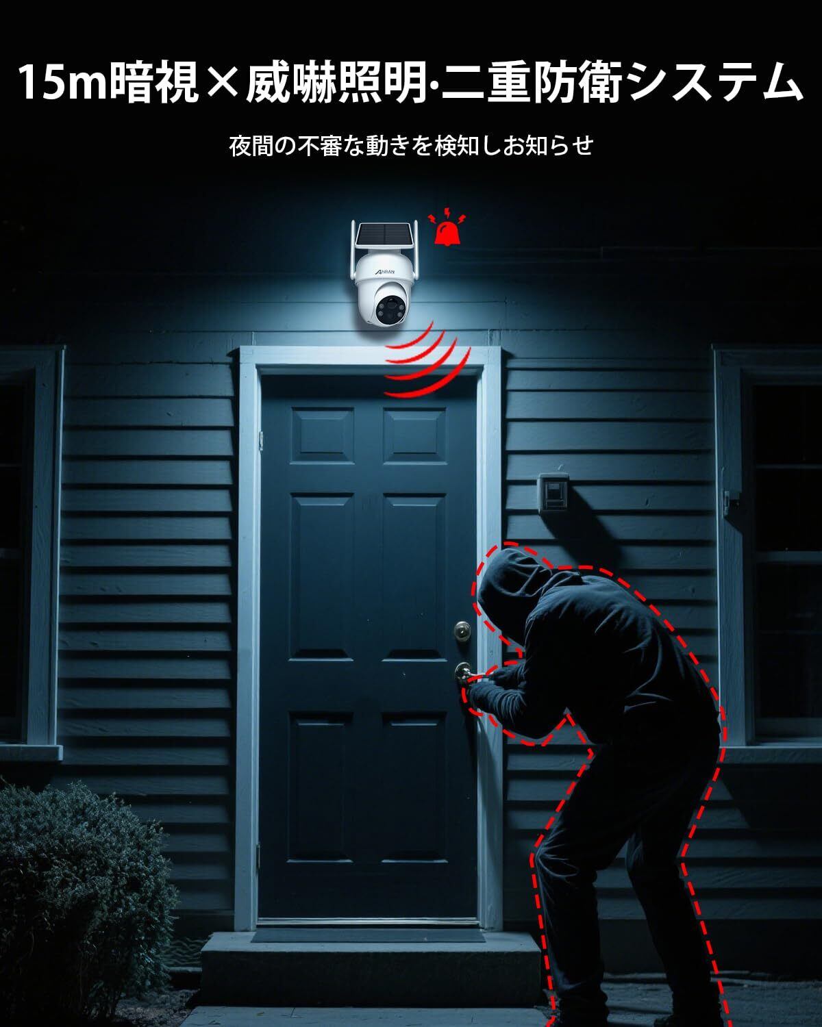 【PIR人体検知・安心なサポート・1年品質保証】高輝度LED 4個を搭載し、人体検知が触発されると、防犯カメラは発光とともに警報を鳴らして侵入者を怖がらせます。人体の検知は温度に依存します。一般的な範囲は 1 ~ 2 メートルです。それを超えると、カメラが検知できない場合があります。また、他の移動物体を検出する必要がある場合は、人型検出機能をオフにする必要があります。弊社の製品は日本電気安全法に準じてPSE認証を取得しており、安心して利用される製品として提供しております。弊社には専門のテクニカルサポートが整っており、12ヶ月品質保証もあり、LINE、電話、メールなど多様なサポートを提供いたします。文字、音声、写真、ビデオ等わかりやすい説明を心掛け、製品に関わる操作方法やご不安を解消します。 お客様により良い体験を提供できる様に対応させていただきます!(対応時間:月~土10:00~13:00 14:30~19:30、E-mail 24時間対応 )