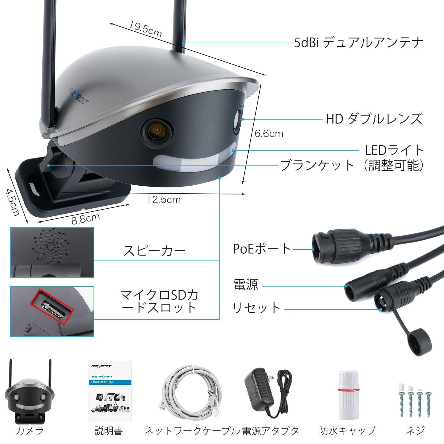 【180°超広角+高精解像度】GENBOLT 屋外 監視カメラの監視範囲は180°超広角で、一台カメラは二台カメラのをカバーします。録画解像度は2560*1440です、高精の録画証拠を保存できます。SDカードを挿入し、動画はリアルタイムで保存し、検出録画も記録します。映像もっと綺麗に表示できます。ません。誤警報を有効に減らせます。無駄な警告に煩わされません。監視範囲内に、人体の形を自動的にフォローして、動き状況が把握できます。AI人体認識の設定方法はとても簡単です。素人でも写真を参考して、分かりやすいです。POE 防犯カメラは設置場所によって、2種類給電モードをサポートします。1.POE給電:スイッチングハブを使用して、NVRとコンセント不要 CAT5ネットケーブル一本で直接電源とネットワークを接続できます。コンセント無くでも、取り付け可能です。最大200メートルサポート可能です。2.DC給電:電源アタプター使用して通常な給電モードもサポートします。(スイッチングハブ別売)