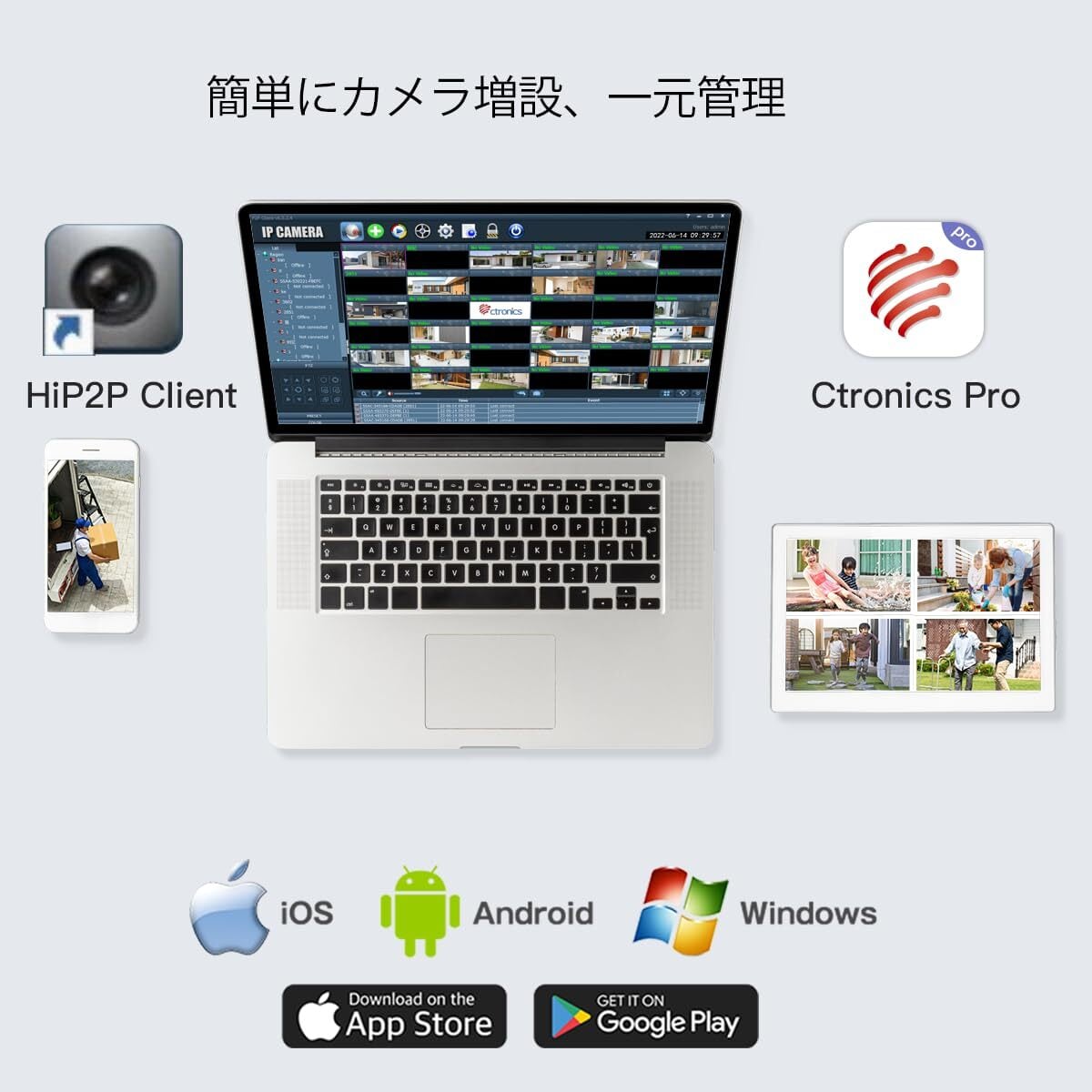 【簡単に増設、一元管理】 複数Ctronicsカメラを全て同一アプリ内で管理しております。スマホ4台まで同時に監視、PCで36台以上の映像を並べて1画面でみられます。家族と映像や通話を共有できる機能も便利で、家庭のセキュリティ向上に非常に役立ちます。手軽にPCからも管理でき、店舗事業用としての使用も問題ありません。
