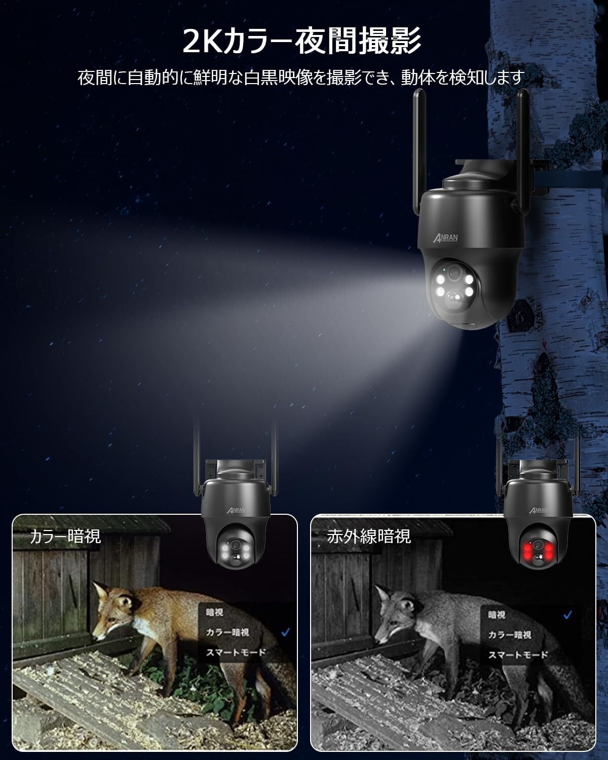 【モーション感知センサーで自動録画+スマホへ通知】ANRAN防犯カメラ 屋外 ワイヤレスで映像内の動きや変化を検出します。検出後に録画を開始します。センサー検出後に写真付きプッシュ通知でその場ぼ状況をお知らせします。監視範囲内の人や動物を感知すると、リアルタイムで状況を確認できるように、アプリケーションのプッシュ通知ですぐに通知されます。カメラ映像内の任意のエリアを指定して、走る車や風により木の揺れを感知範囲から除外することが可能です。指定のエリア内のみ反応・録画します。