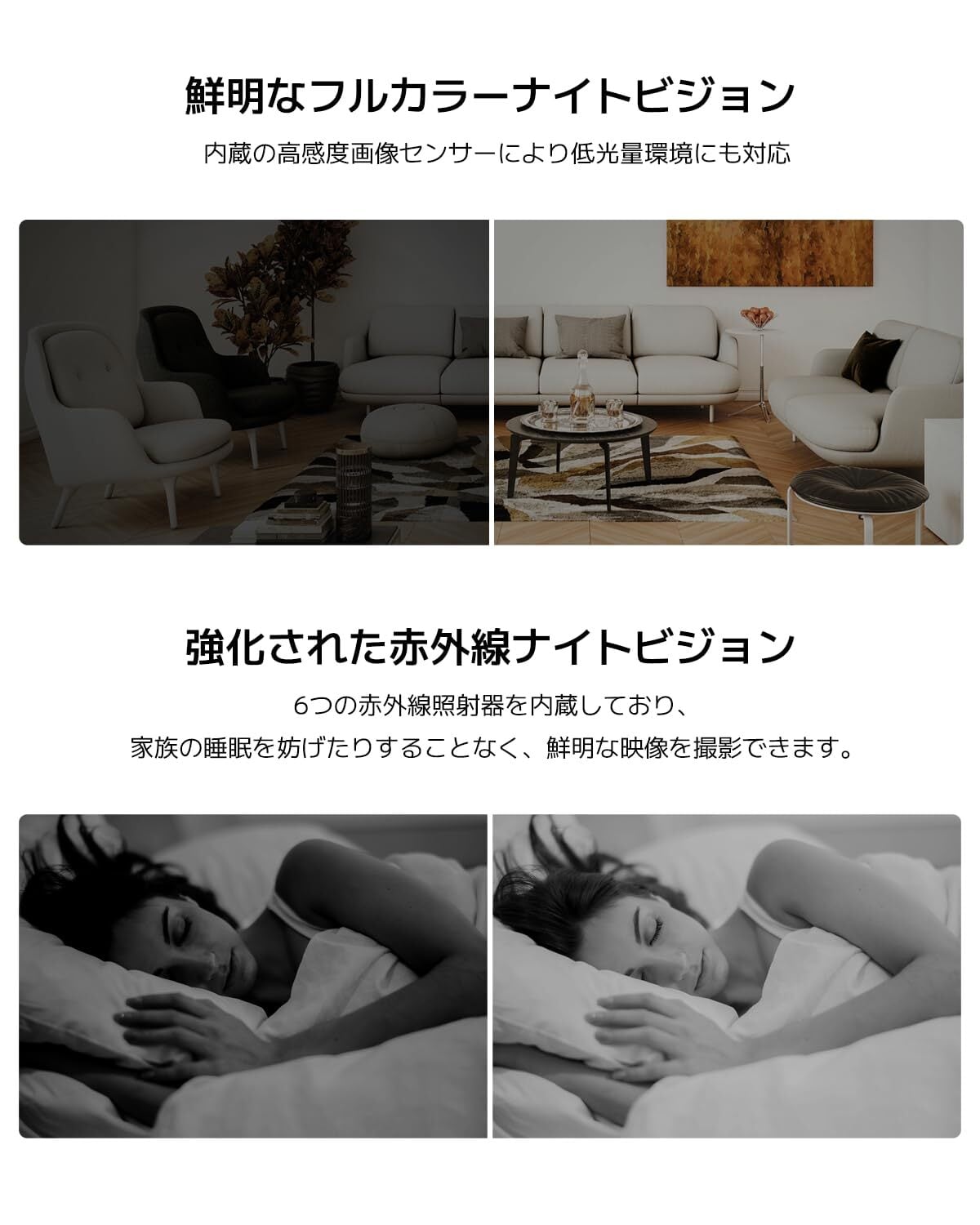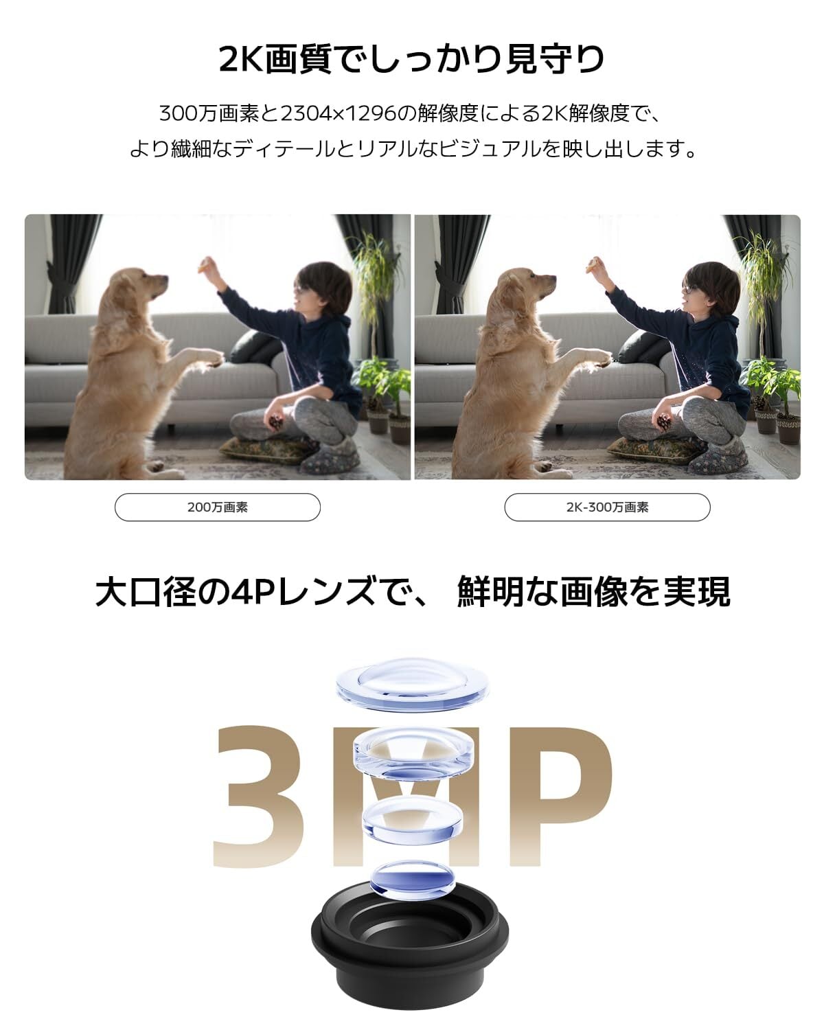 【2K画質でしっかり見守り】300万画素と2304×1296の解像度による2K解像度で、より繊細なディテールとリアルなビジュアルを映し出します。また、大口径の4Pレンズを搭載し、光の屈折を効果的に低減。クリアで鮮明な画質が実現し、曇りのないリアルな映像を映し出します。