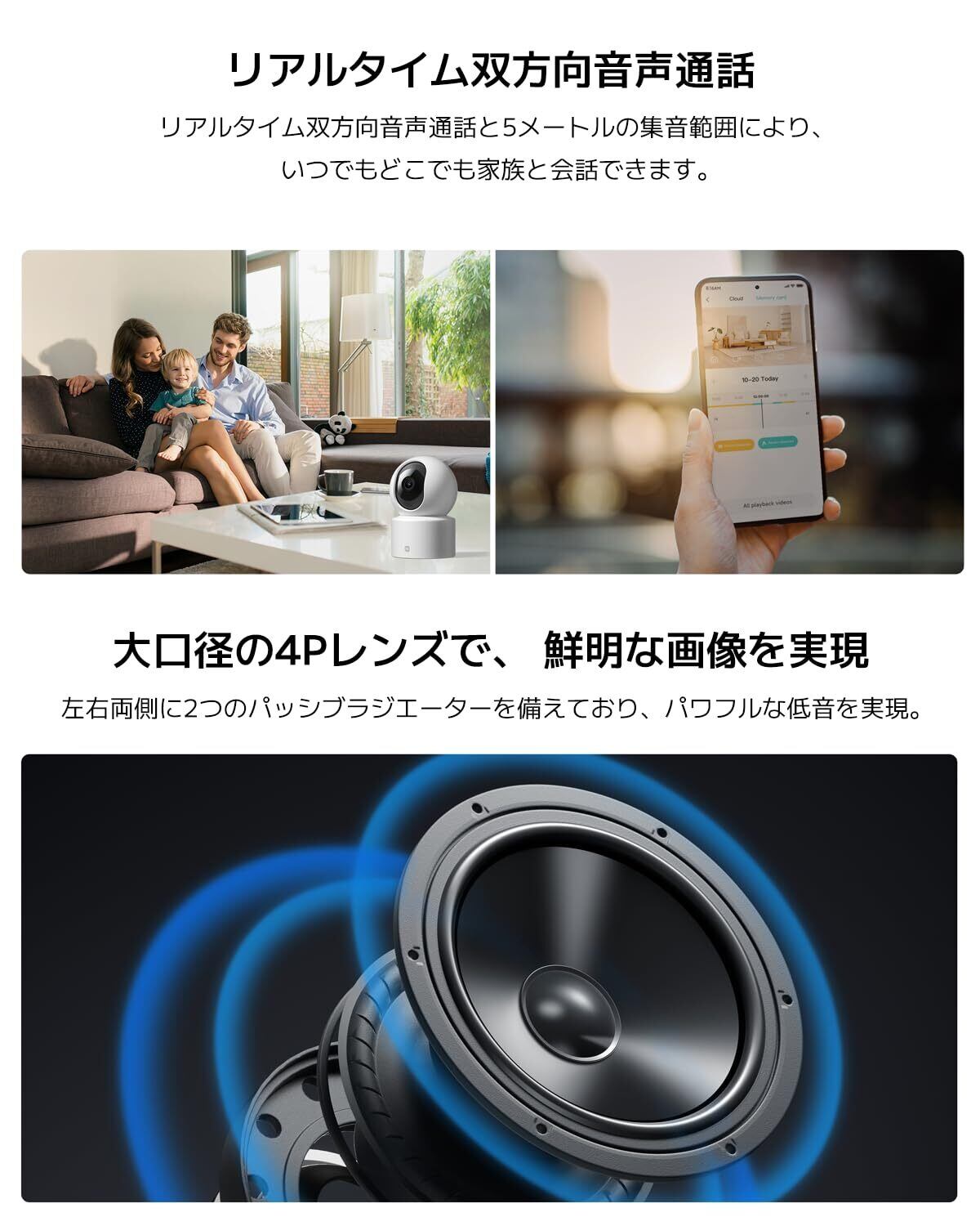 【双方向音声通話】リアルタイム双方向音声通話と5メートルの集音範囲により、いつでもどこでも家族と会話できます。大型スピーカーとインテリジェントなノイズリダクション機能を備えたマイクにより、大音量のクリアな音声で離れていても家族と会話ができます。
