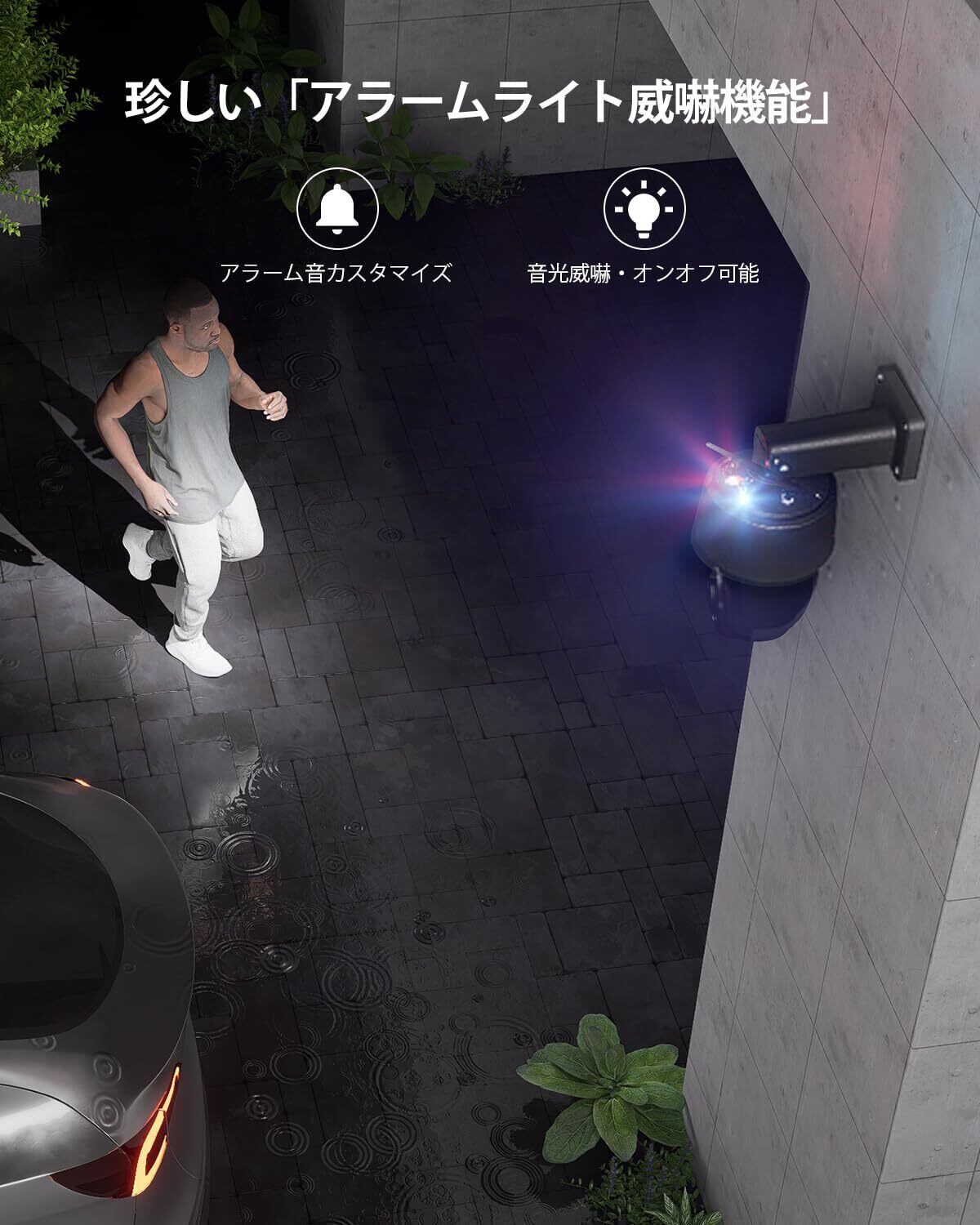 【珍しいアラームライト威嚇機能】 AI技術で人、車両、ペットを正確に検出・追跡して、オートフォーカスします。さらに人間を検知すると赤と青のLEDライトが交互にチカチカと点滅するので、侵入者に対する威嚇効果は大きいです。この機能はアプリで簡単にON/OFFの設定ができるので、人通りの多い日中はOFFにして人通りが減る夜間だけONにしておくという使い方もできます。