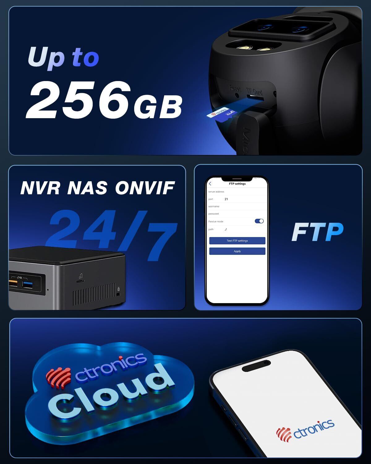2.4Gおよび5G WiFiに対応し、高速かつ安定した接続を実現。スマートフォンやPCからライブ映像にアクセス可能で、256GBのMicro SDカードとクラウドストレージ以外、カメラ本体のSDカードとPCの記録媒体両方に記録でき、カメラ本体を破壊されてSDカードを抜き取られても、PCに録画記録は残るので安心できます。