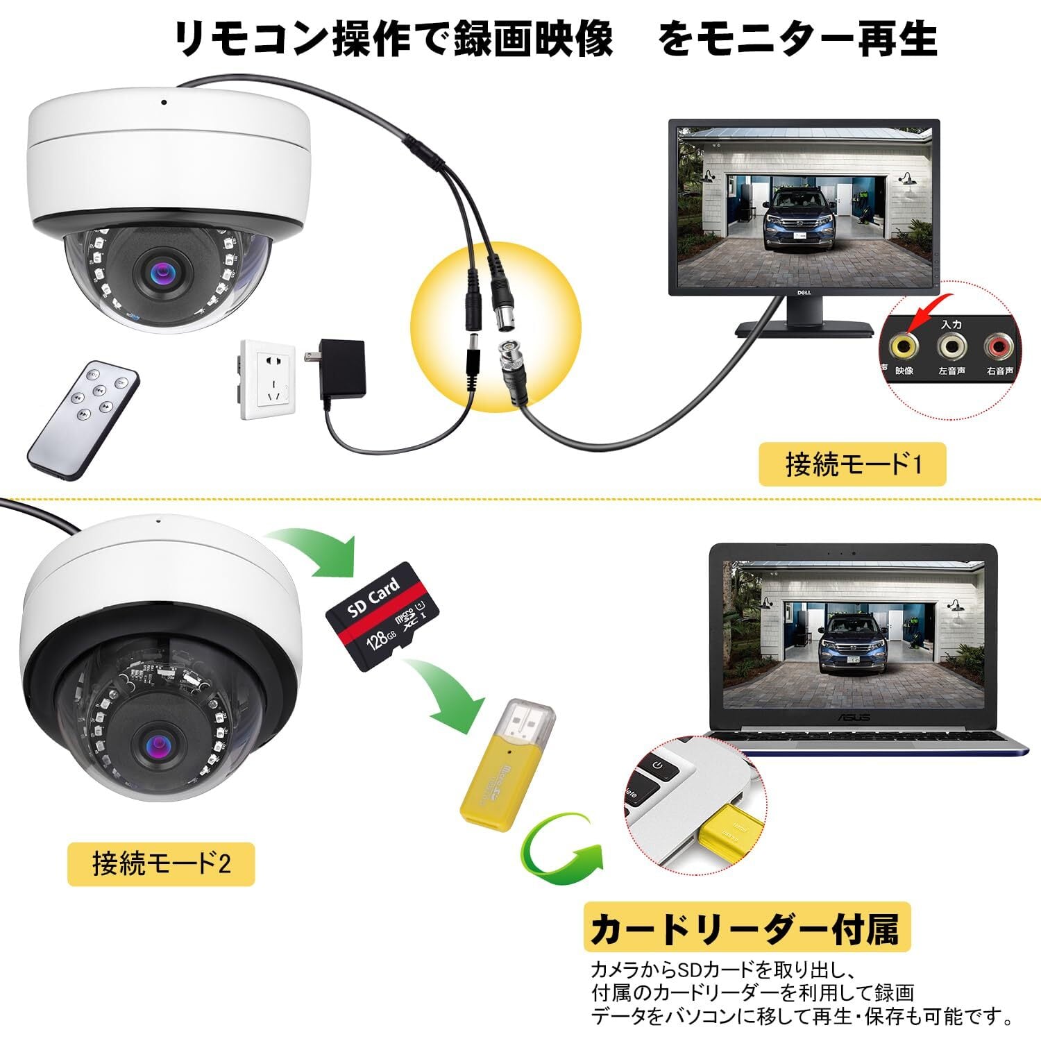 防犯カメラドーム型 200万画素 屋内屋外 有線 最大256GB microSD カード対応 SDカード録画 玄関口 駐車場防犯 監視カメラ AV出力対応 録音機能付き 連続録画 強力赤外線LED 暗視撮影 外部電源 簡単設置 リモコン操作 防水防塵仕様 日本語取扱説明書付き(128GB SDカード内蔵)