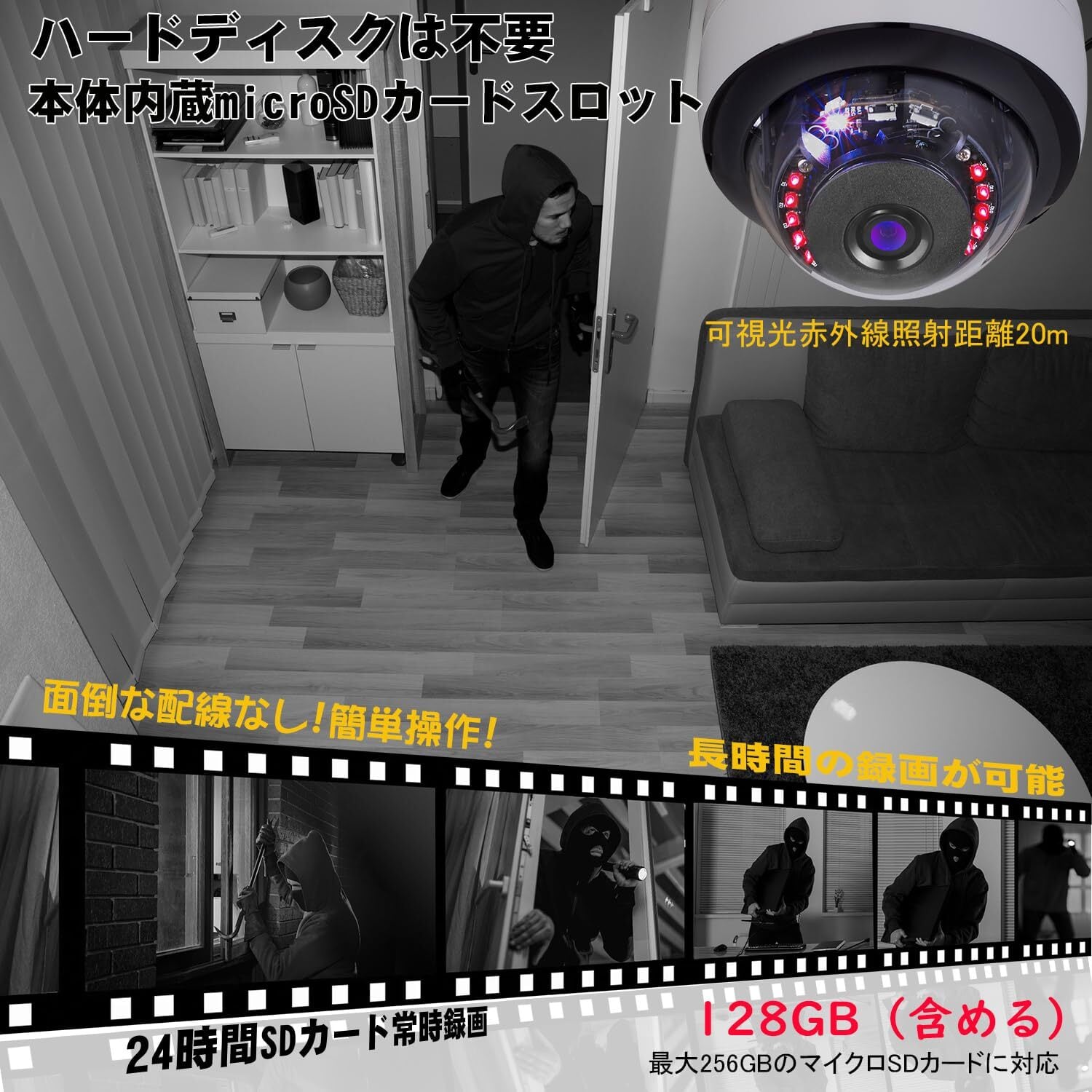 【WIFI接続不要&内蔵SDカードに録画データ保存】本有線監視カメラはWIFI接続不要で、プライバシーをより保護できます。◆ハードディスクは不要で、カメラ本体にマイクロSDカードスロット搭載し、SDカードをカメラ内部に取り付けてデータを保存します。データはパソコンで再生できます。◆自動上書き機能、常に最新のデータを保存し、録画データを上書き保存する。◆最大256 GBのマイクロSDカードに対応しており、この商品にはすでに128 GBのマイクロSDカードが含まれています。