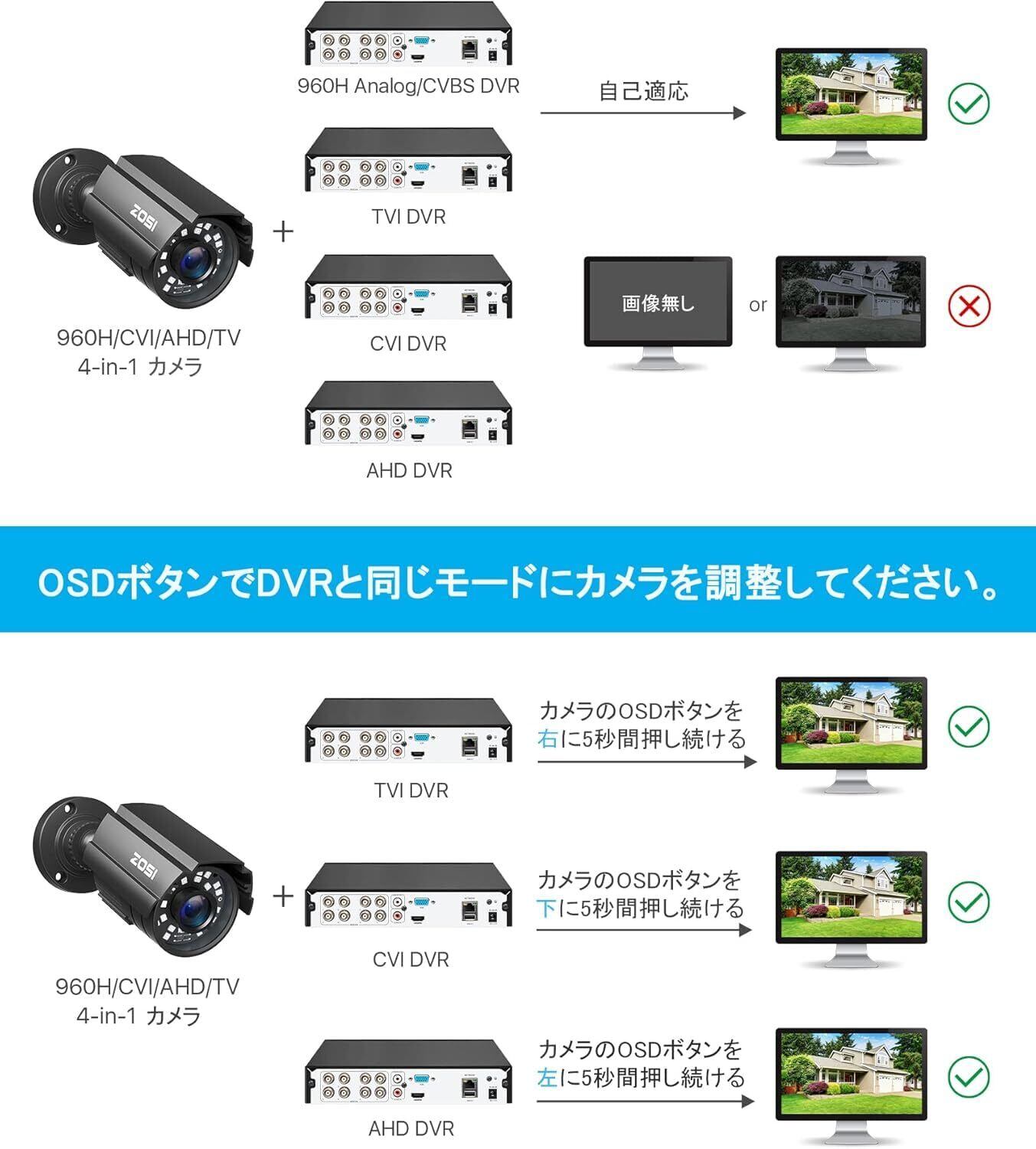 ZOSI 1080P 200万画素防犯カメラ 監視カメラ アナログカメラ ahdカメラ 4-IN-1防犯カメラ 赤外線24個 3.6MM広いレンズ 防水カメラ IP66防水仕様 屋外屋内設置可能