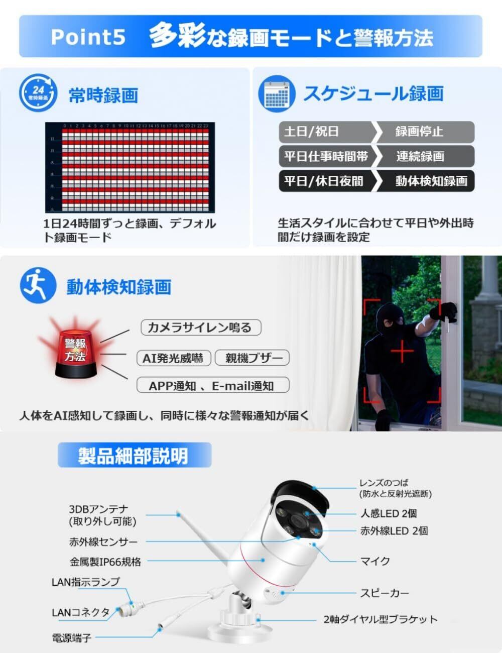 【24時連続録画】:24時間常時録画と動体検知録画を同時に有効にすることができます。重要な瞬間を見逃さず全部記録して、後で気になった事を思い出しても録画データを遡って調べることができます。不審な動きを検出した部分だけ調べることが可能なので、多くの時間がかかりません。