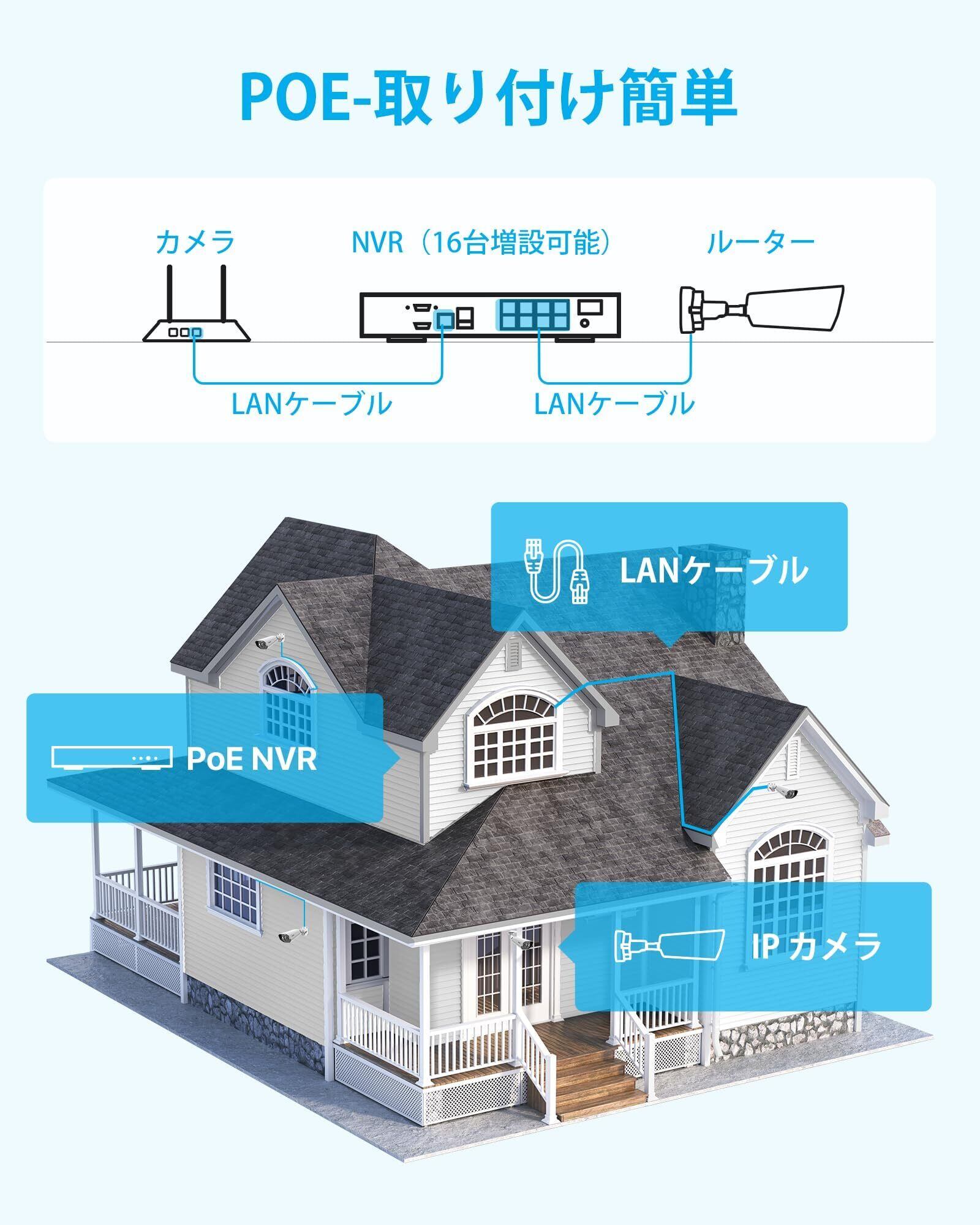 【800万画素PoE防犯カメラ】このpoe防犯カメラは屋内屋外カメラです。単独に使用することはできません。イーサネットケーブルとpoe防犯レコーダーを接続する必要があります。 ZOSI poe防犯レコーダーだけと互換性があります。