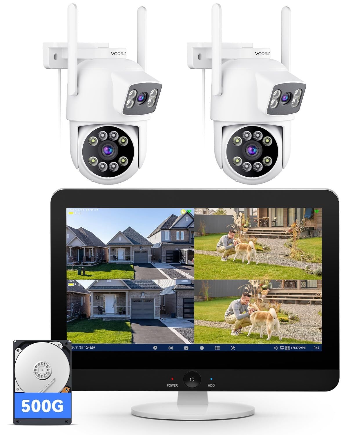 【デュアルレンズカメラ・自動追尾・常時録画】VORGUT ワイヤレス防犯カメラ 12インチモニター録画機 無線 監視カメラ 防水IP66 360°パンチルト投光 威嚇機能 工事不要 簡単設置 5年保証(300万画素カメラ×2台+12インチモニター+500GB HDD内蔵)