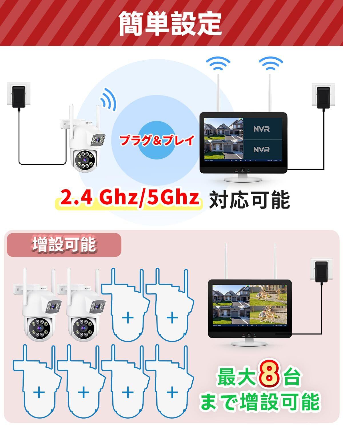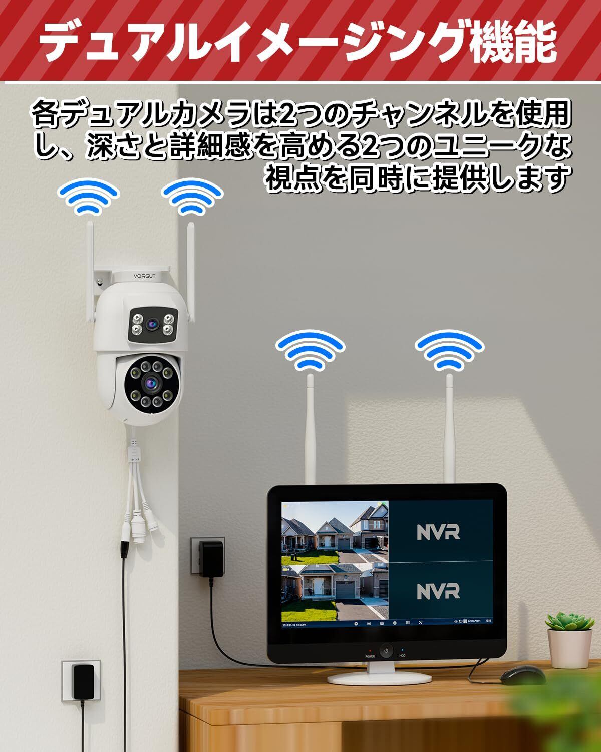 【新春セール】【デュアルレンズカメラ・自動追尾・常時録画】VORGUT ワイヤレス防犯カメラ 12インチモニター録画機 無線 監視カメラ 防水IP66 360°パンチルト投光 威嚇機能 工事不要 簡単設置 5年保証(300万画素カメラ×2台+12インチモニター+500GB HDD内蔵) | paghag
