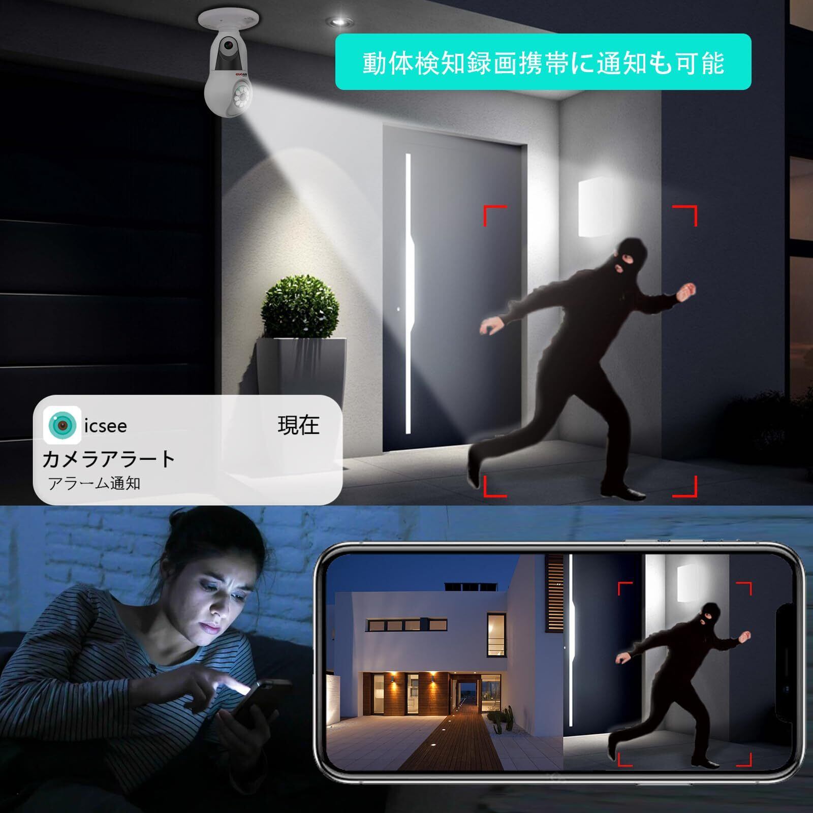 【5Ghz/2.4Ghz WiFi対応】 GUOANVISION 防犯カメラ 電球型,6MP デュアルレンズ ワイヤレスカメラ,室内ペットカメラ,AI追跡 360°パン 90°チルト カラーナイトビジョン,双方向通話 モーション検知 スマホ通知,E27ソケット Alexa連携 警報機能 SD/クラウド保存 [2025年