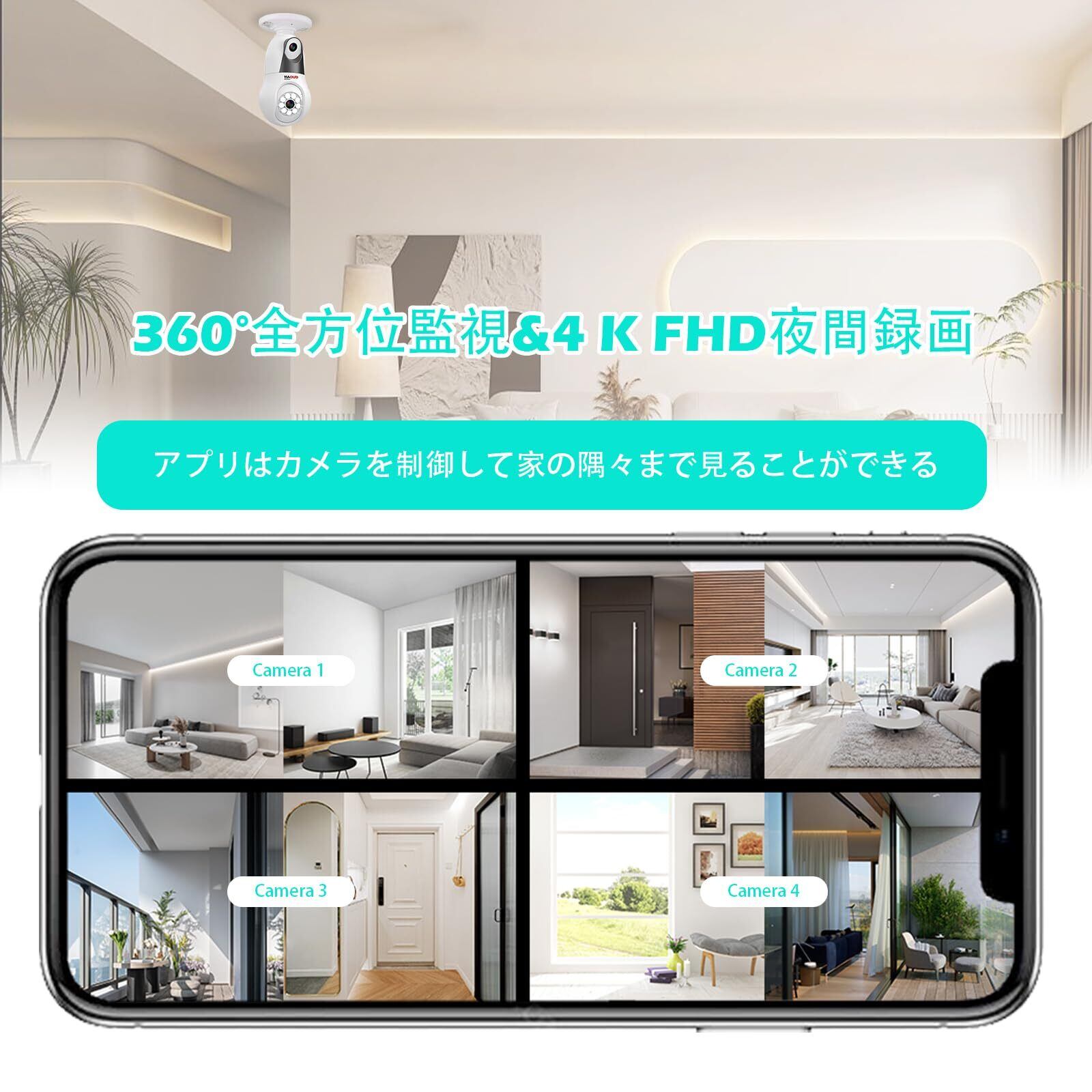 【人気商品】【5Ghz/2.4Ghz WiFi対応】 GUOANVISION 防犯カメラ 電球型,6MP デュアルレンズ ワイヤレスカメラ,室内ペットカメラ,AI追跡 360°パン 90°チルト カラーナイトビジョン,双方向通話 モーション検知 スマホ通知,E27ソケット Alexa連携 警報機能 SD/クラウド保存 [2025年
