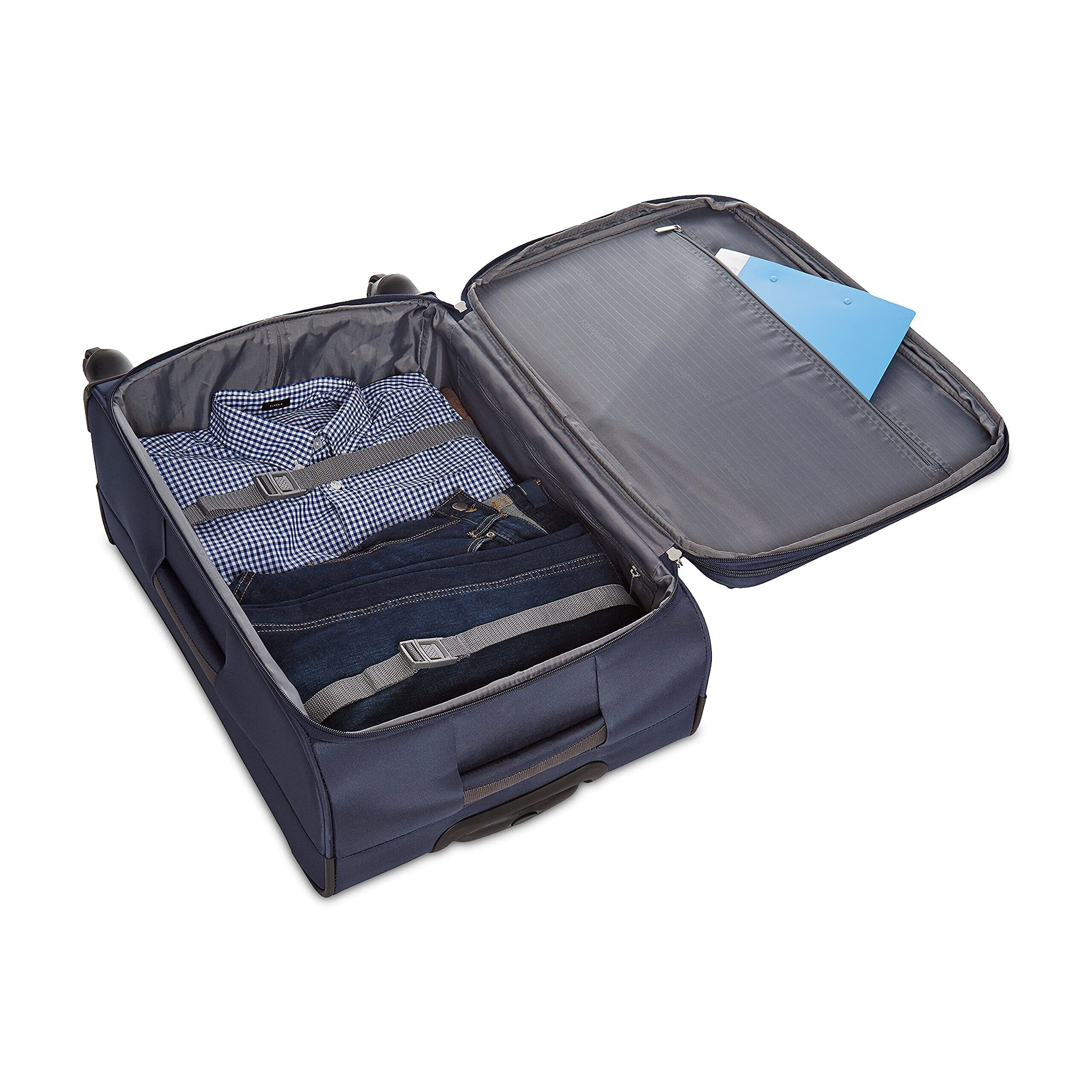 ソフトサイドデザインは、(ハードサイドに比べて)狭いスペースによりフィットしやすいように少したたむことができます