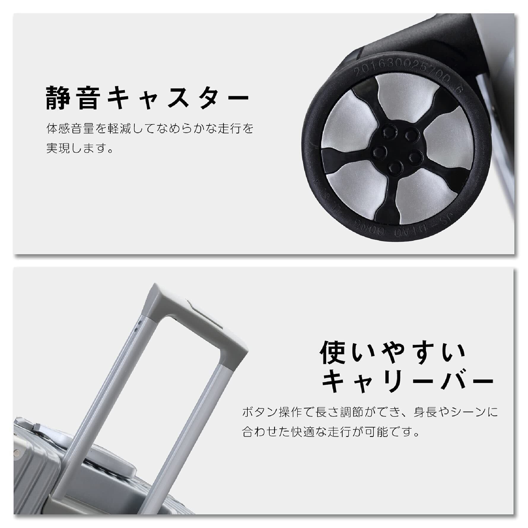 【底足付き】スーツケースの底部に取り付けられた足は、スーツケースを地面から浮かせるため、底部の衝撃や損傷から荷物を保護します。また、底足はスーツケース自体の耐久性も向上させます。