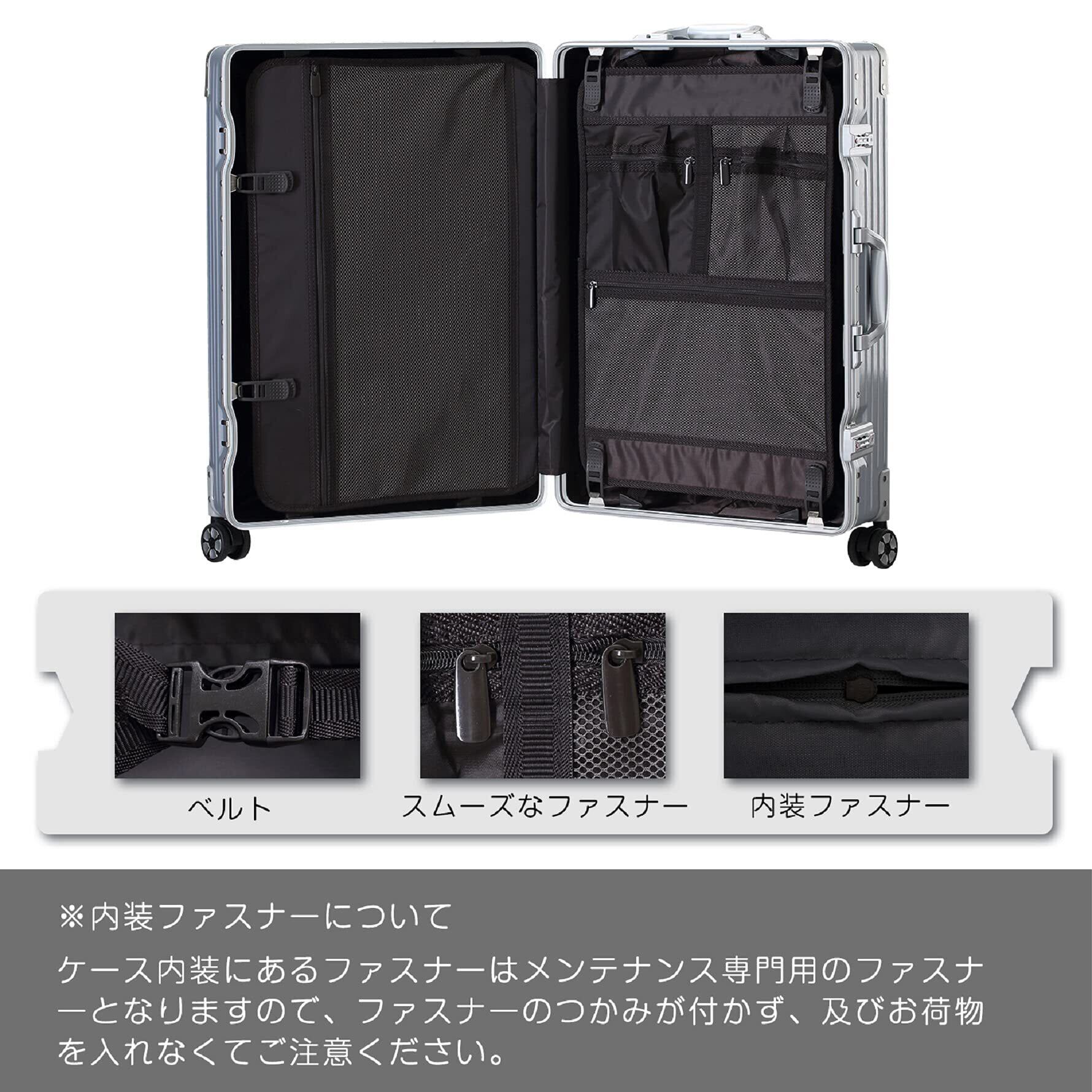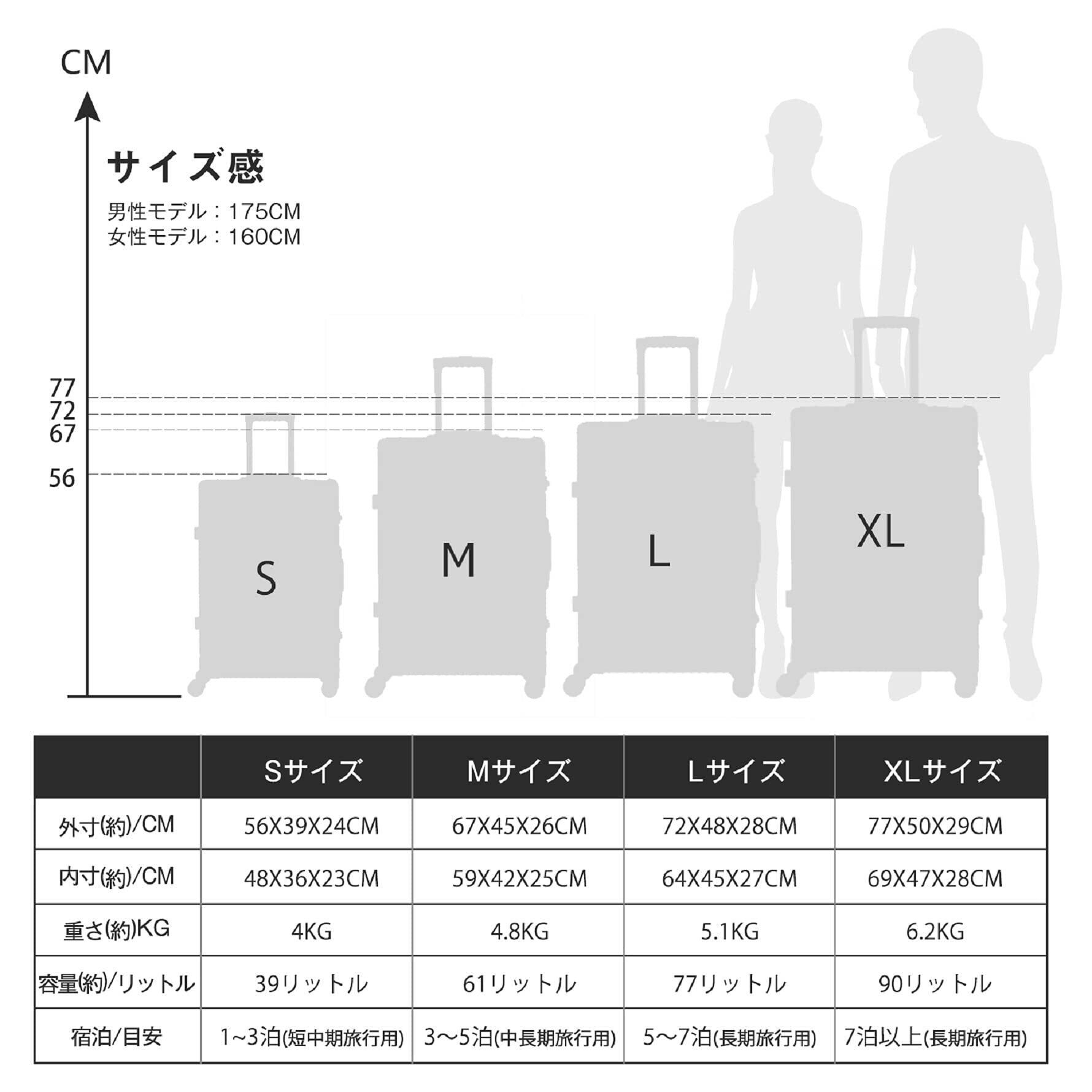 【TSAロック】TSAロックを使用することで、運輸保安局の職員が必要に応じて荷物を検査する際、ロックを破壊することなく開錠することができます。 【注意】①TSAロックには鍵穴がありますが、鍵は付属しません。②スーツケースのサイドにロックを装備する数量:S/M/Lは二つロックがあります。 XLはスーツケースの安定性と密閉性を維持するために、サイドに三つロックを装備して、上も一つロックを装備します。