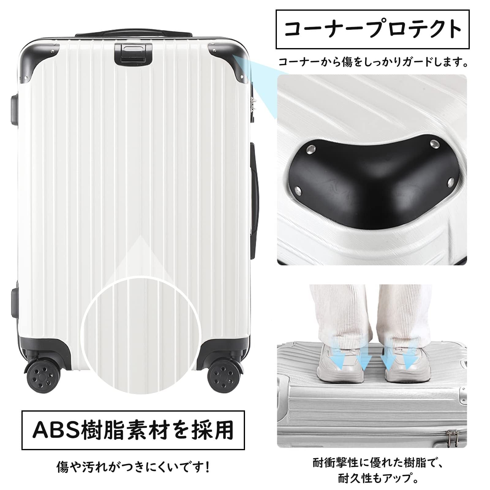 【丈夫かつ軽い素材】軽さと堅固性に優れているポリカーボネートとABS樹脂を配合したボディ。女性でも持ち上げられる軽さですが、衝撃に強く中の荷物をしっかりと守ります。 衝撃にも強く、無数に細かい凸凹が傷をつきにくくしてくれます。