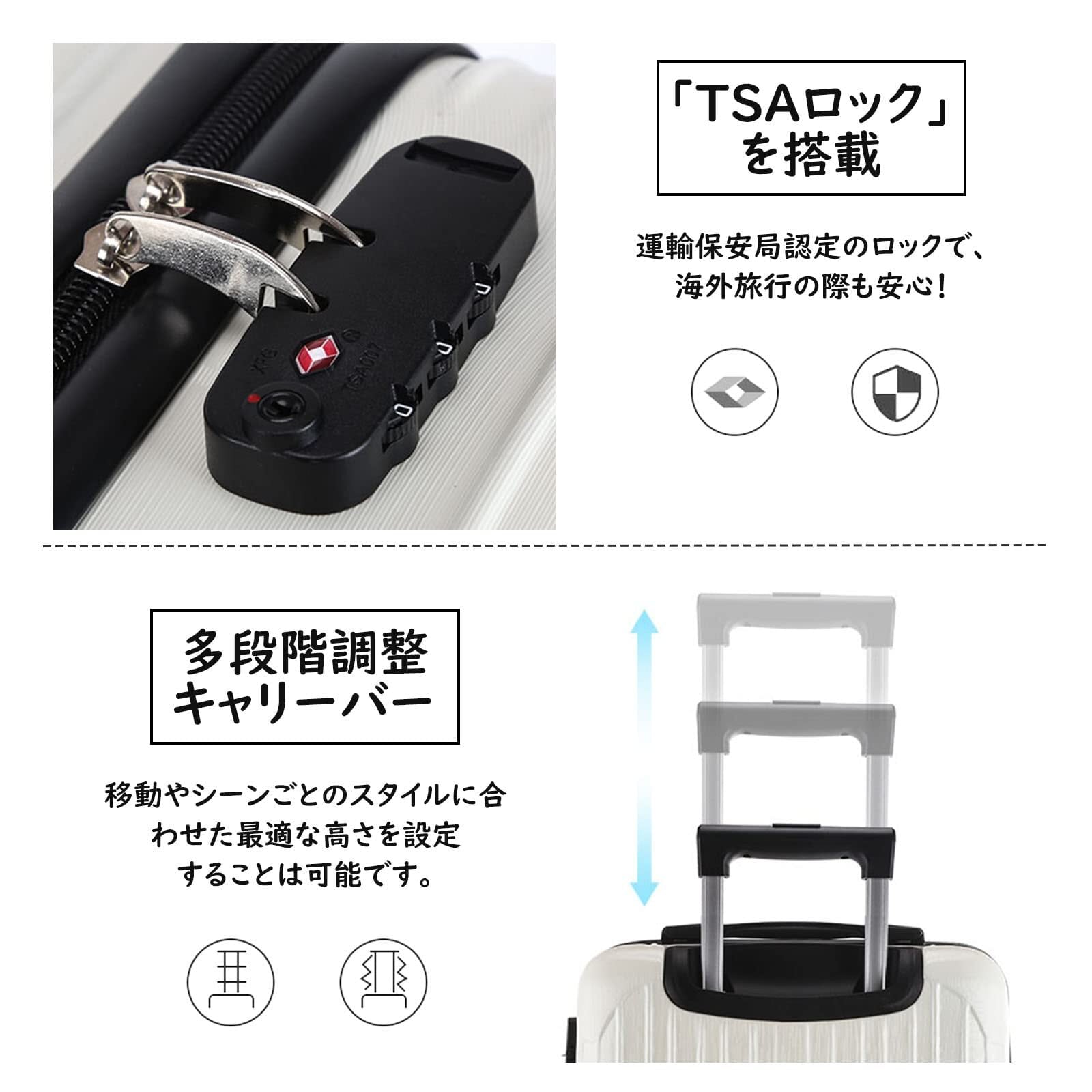 【段階調節可能なキャリーバー TSAナンバーロック】ボタン一つでキャリーバーの高さを調節できます。三段階調整可能ハンドル キャリーバー耐久性抜群 男性でも女性でも使いやすい、調整ハンドルを採用。TSAロックも装備されていて、海外旅行にもピッタリ。3桁のナンバーロックを使用し、鍵をなくす心配はありません。