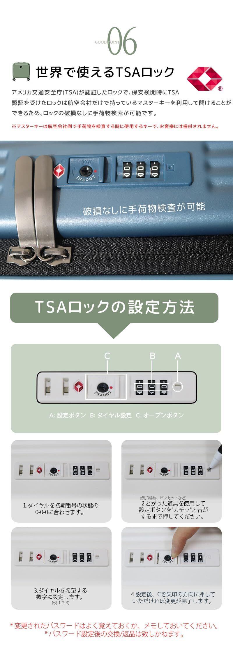 【TSAロック】TSAロックはアメリカ交通保安局認証を受けたロックで、TSAロック付きキャリーはマスターキーでのみ開けることができるため、バッグの毀損なしで検査が可能です。マスターキーは、航空会社で手荷物を検査する際に使用する鍵で、構成に含まれません。