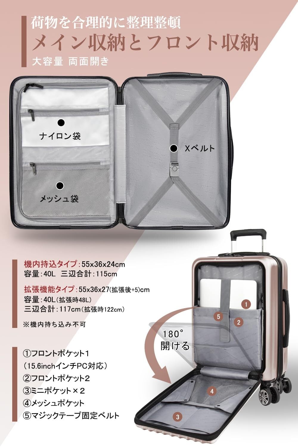 【商品仕様】拡張機能なしタイプ:容量40L・外寸55×36×24cm(三辺合計115cm)で機内持ち込み可能です。拡張機能付きタイプ:最大容量48L(拡張後)・外寸55×36×27cm(三辺合計117cm)で機内持ち込み不可です。