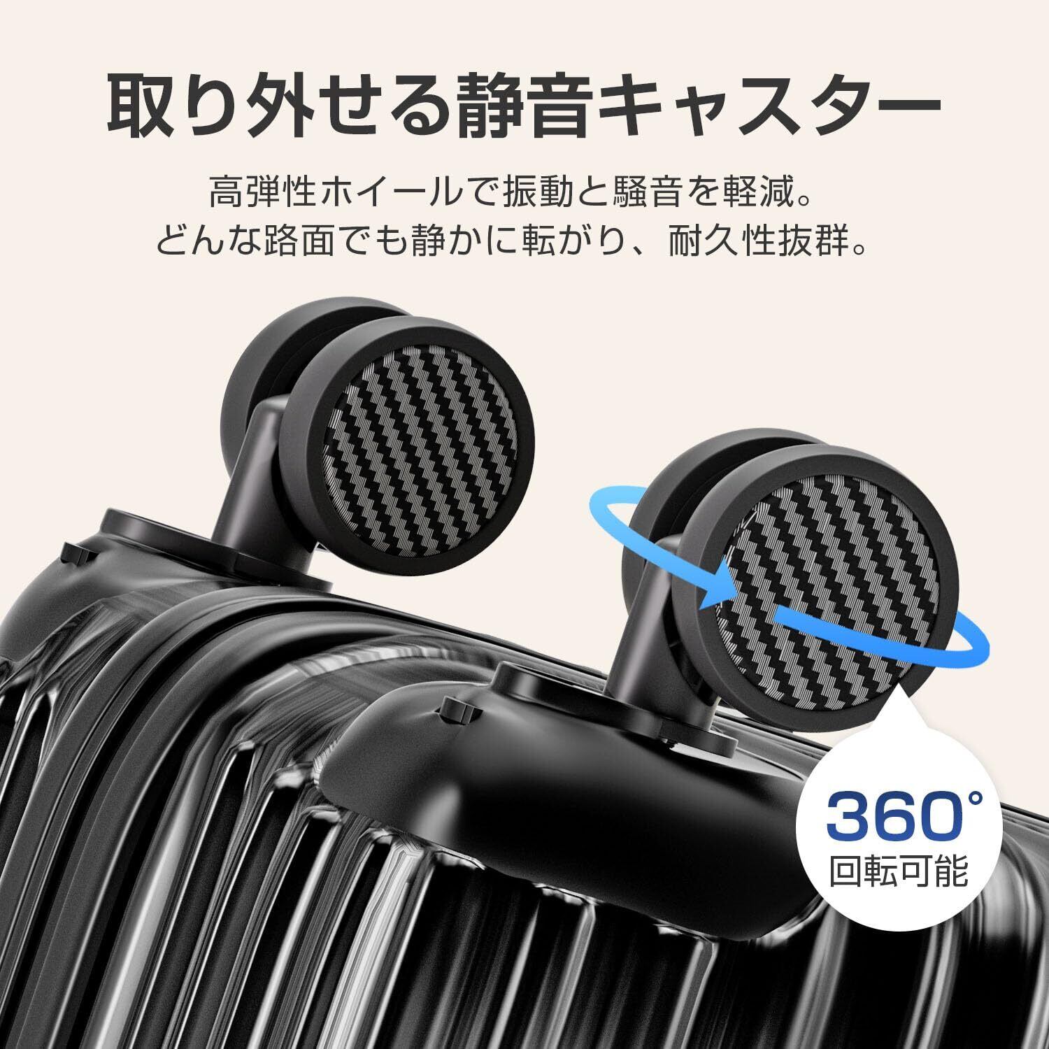 【360°回転静音キャスター&着脱式設計】 スムーズな移動を実現する静音ダブルキャスターは、360°自在に回転し、混雑した空港内や狭い通路でもストレスなく操作できます。キャスター部分は取り外しが可能なため、交換・メンテナンスもしやすく、長く愛用できるキャリーケースです。