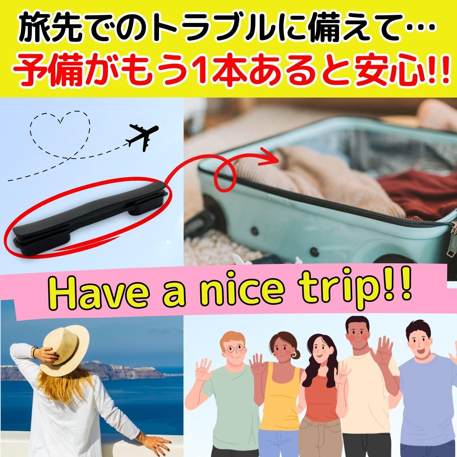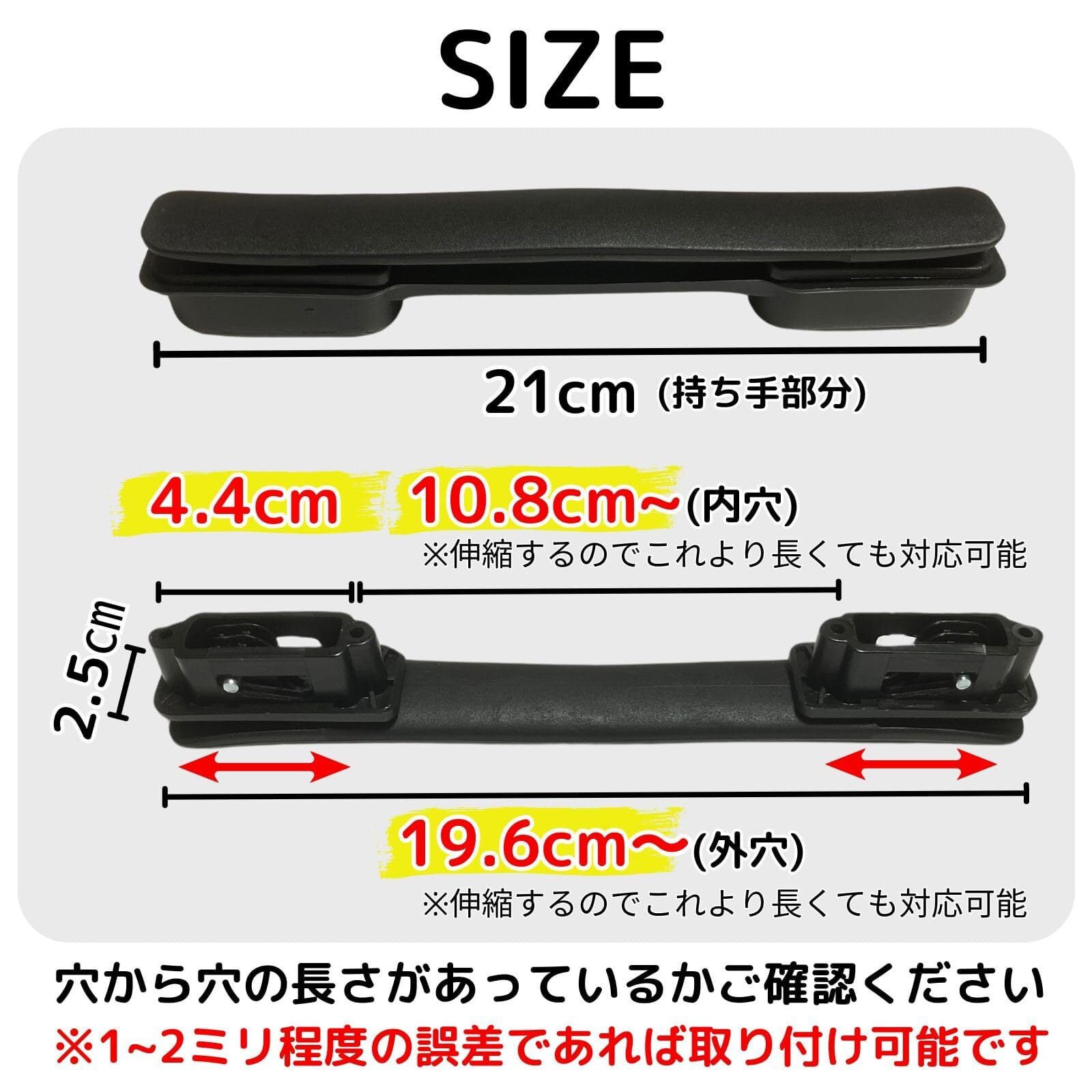 【簡単交換】Leap Raupeのスーツケースハンドルは、特別な工具や専門的な知識を必要とせず、付属のネジとプラスドライバーだけで誰でも簡単に取り付け可能。旅行前にスーツケースの持ち手が壊れた場合でも、修理に出したり新たにスーツケースを購入する必要がなくなります。 【経済性】こちらのハンドルは耐久性があり握りやすい設計なので手がつかれず快適な旅行をサポートします。コストを抑えつつ、スーツケースを長く使用することができます。 【耐久性】この交換用ハンドルは、高品質な素材を使用して製造されており、長期間の使用にも耐えることができるので、頻繁に旅行する方やビジネスで頻繁に移動する方でも安心してご使用いただけます。 【汎用性&快適な使い心地】この交換用ハンドルは、多くのブランドのスーツケースにも適合します。お持ちのスーツケースのブランドに関係なく、このハンドルを使用して修理することが可能です。人間工学に基づいて設計されています。長時間の持ち運びでも手に負担をかけません。旅行中のストレスを軽減し、より快適な旅行体験を提供します。 【ご確認ください】ご購入前に、ご自身のスーツケースやキャリーバッグのハンドルサイズと、商品ページのサイズが合致しているかをご確認ください。数ミリ程度のズレであればほとんどのメーカーの商品に取り付けられます。 【安心の30日返品保障】商品のサイズが合わなければ30日以内であれば未使用品に限り返品可能です。お気軽に注文してご自身のスーツケースに合うかどうかお試しください。この機会に弊社Leap Raupeの交換用スーツケースハンドルを是非ご注文くださいませ。