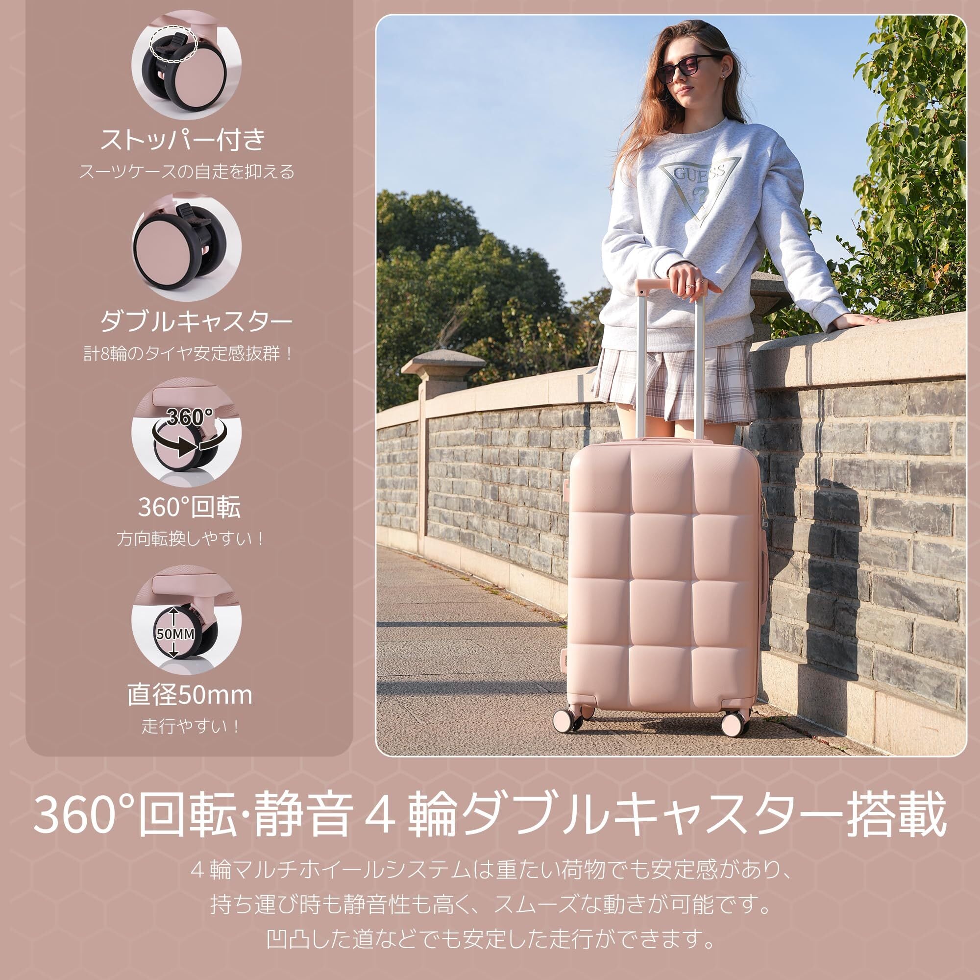 【商品仕様】※S size:外寸:約55×40×20cm 内寸:約45×38×20cm 本体重量:約2.87KG 、1~3泊に似合い。Sサイズは機内持込が可能なスーツケースです。飛行機内だけでなく、一人旅行や故郷帰りの新幹線やバスなどの車内移動も便利なスーツケースです。※M size:外寸:68×43×24.5cm 内寸:約60×40×24.5cm 本体重量:約3.9KG、4-7泊以上 。※L size:外寸:約77×49×29cm 内寸:約68×47×29cm 本体重量:約4.5KG、7泊以上。