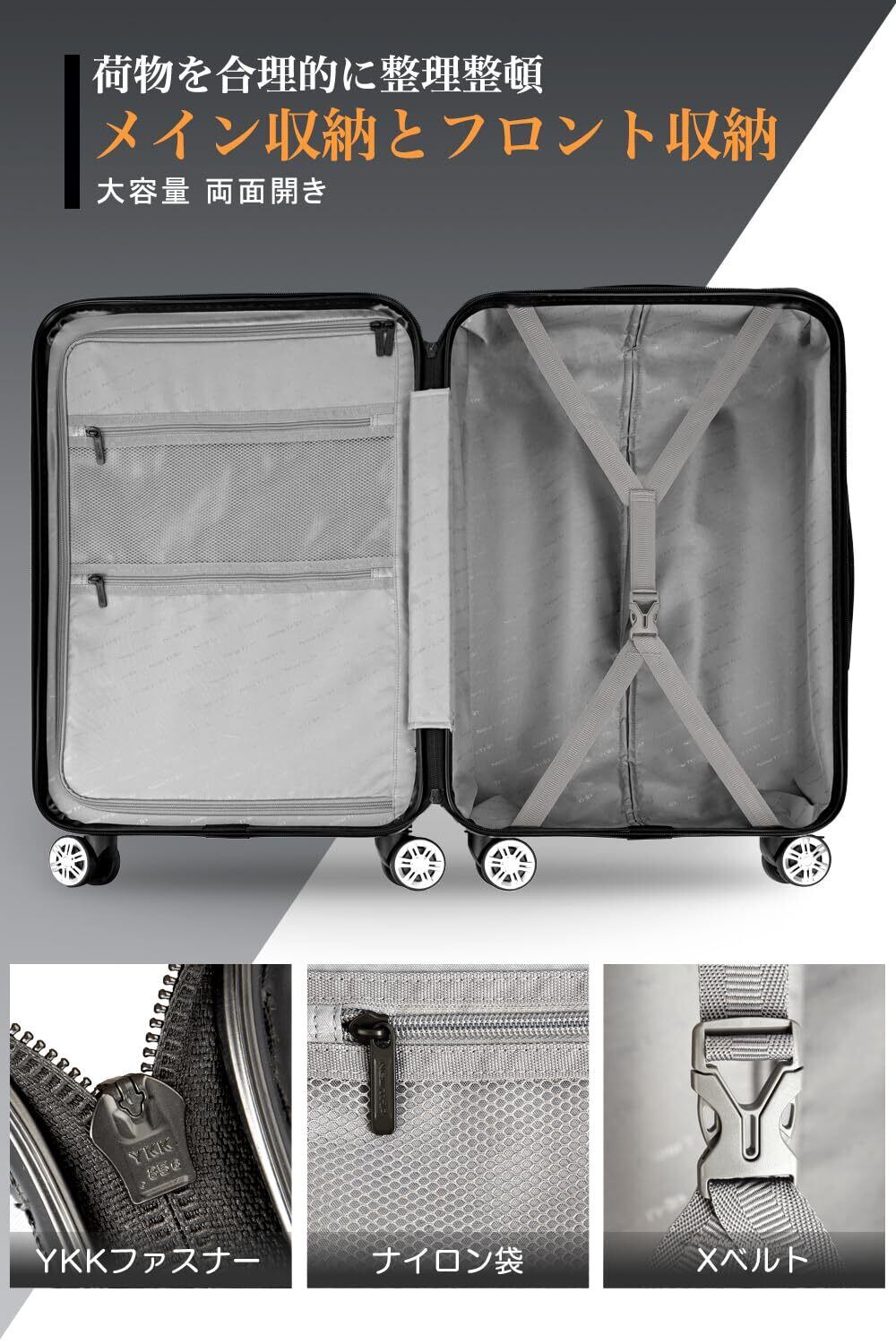 【高品質なボディ&信頼のYKKファスナー】ABS樹脂は軽くて弾力性と割れに強く、PC(ポリカーボネート)樹脂は耐衝撃性・断熱材に優れる、両素材を混合した耐久性が高いハードタイプの高品質ボディを実現しています。また、日本が世界に誇るYKKファスナーをメインファスナーに標準装備。ファスナータイプのスーツケースによくあるファスナーの不具合(ファスナー脱線や開き)を解消し、長期にわたり安定した使用感が可能となりました。