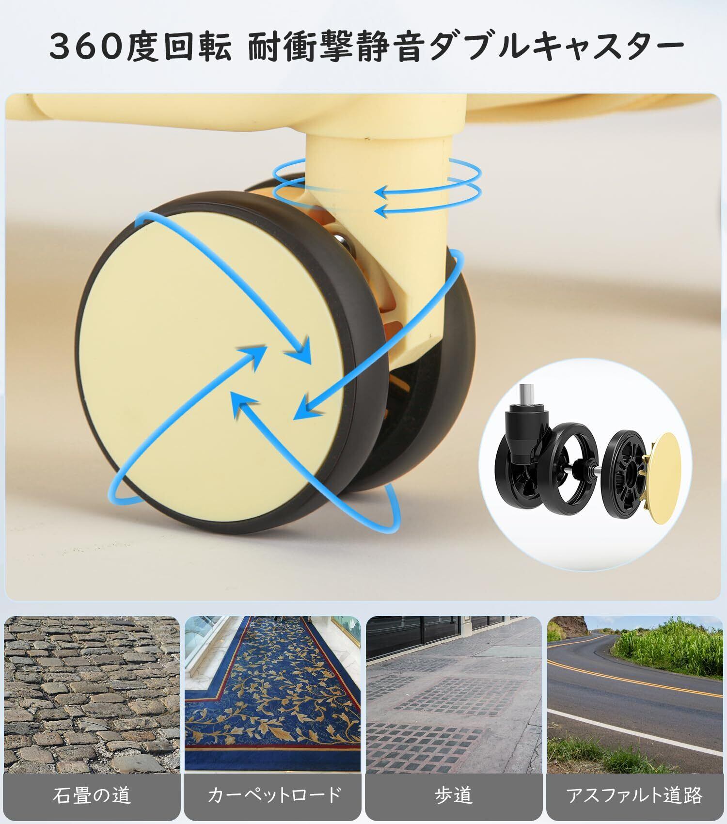 【360度回転 耐衝撃静音ダブルキャスター】高弾性TPE衝撃軽減素材のキャスターを採用し、より静かで耐摩耗性も向上しています。スムーズな滑りを実現しながら、360度の自由回転もできます。ダブルキャスターデザイン、旅先での移動をよりリラックスで快適になります。角部に硬質コーナープロテクトを追加、衝撃を効率的に吸収でき、より長くご利用いただけます。