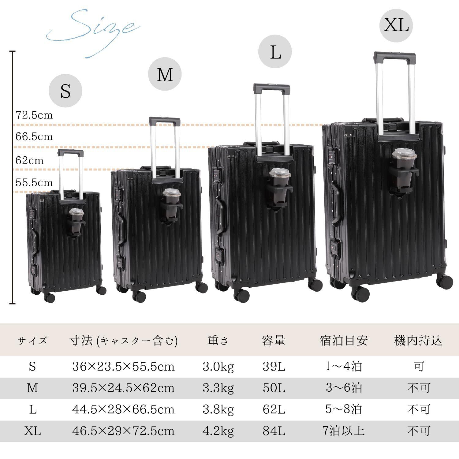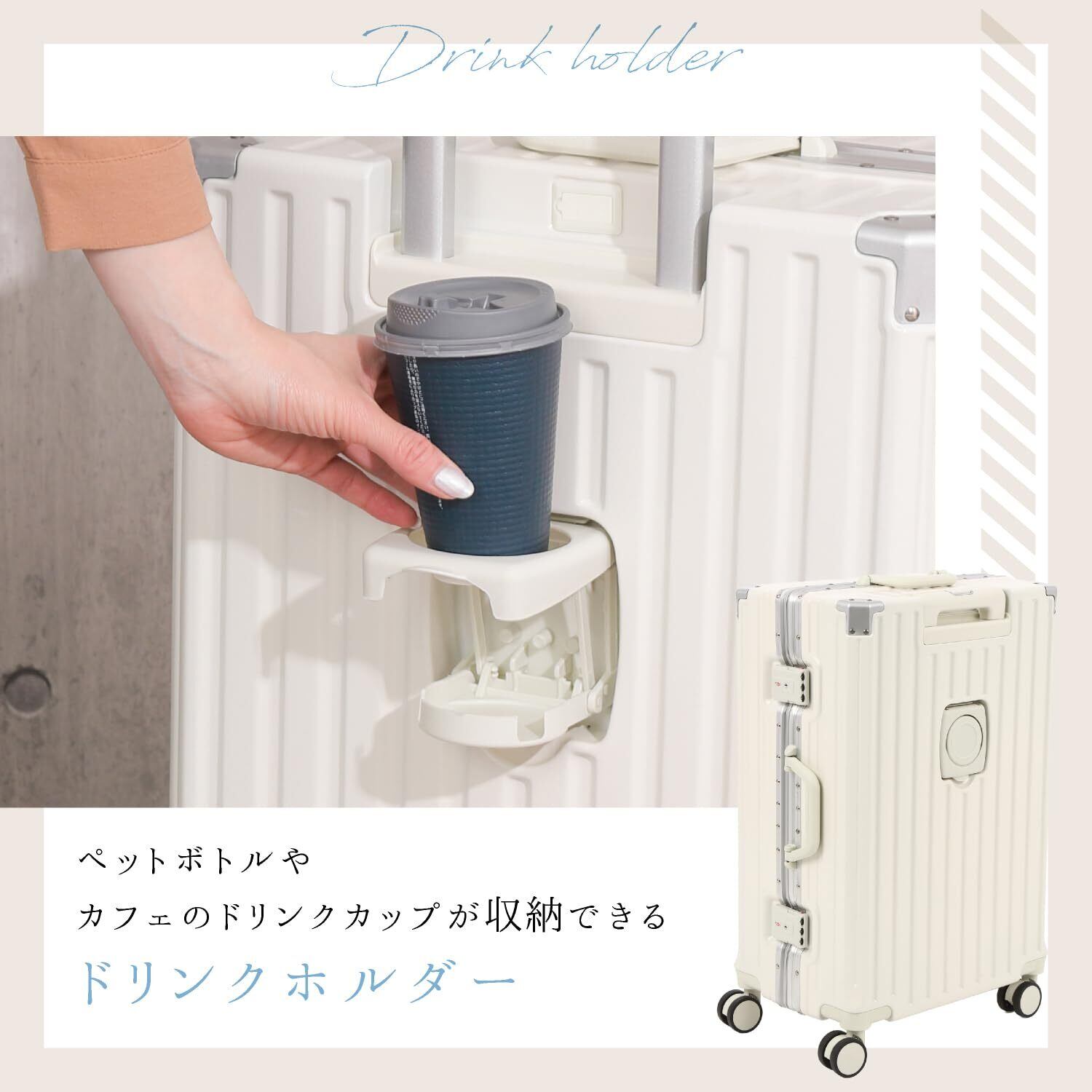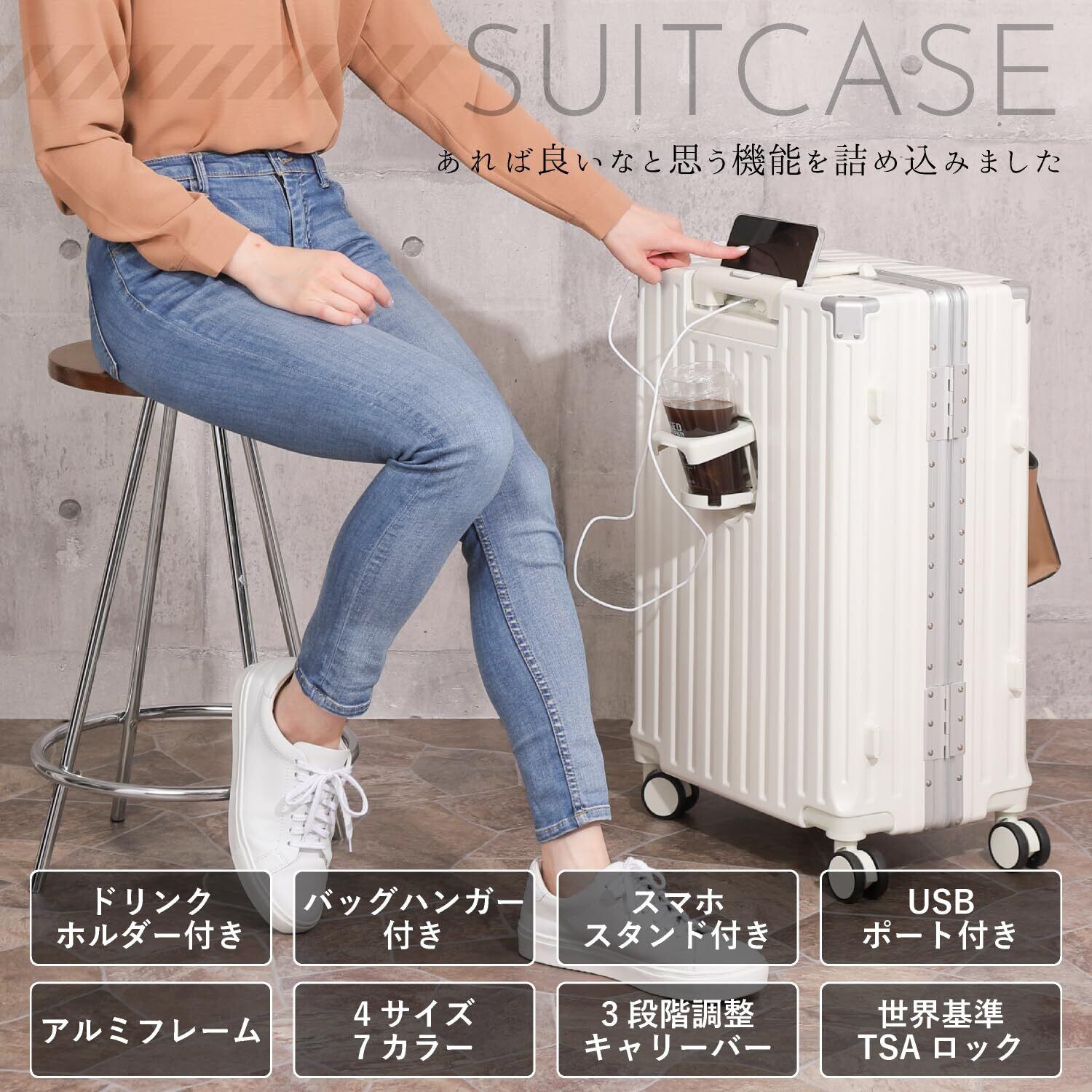 頑丈でありながら軽量なスーツケース】高級感あふれるアルミフレームと縦縞デザインで、飽きのこないデザイン性でおしゃれなサイズのスーツケースです。軽量設計で、女性でもらくらく持ち運びできるので、階段や段差などの移動もスムーズに行えます。 【キャスターは静かに移動】アルミ製のハンドルは伸縮調節が可能、身長に合わせて持ちやすい高さをキープ。自由自在に動くキャスターは静穏性が高く、街中やマンションの廊下でもゴロゴロ音が気になりません。丈夫なABS素材で、耐衝撃性に優れています。 【自由自在にパッキング】高品質のポリエステル生地で柔らかく、メッシュポケットで効率的に仕分け収納。収納グッズやポーチ、小物入れを使う方、着替えやお土産をたくさん詰めたい方におすすめ。ベルトが付いているので、荷物崩れを防ぎます。 【TSAダイヤルロック式で簡単施錠】TSAロック設定の説明書付。鍵紛失の心配がないダイヤル3桁をセットするロック式。(鍵穴がありますが、税関検査用の鍵穴でありお客様用の鍵はございません。)旅行先で鍵を失くす心配がありません。3泊~6泊のビジネスの出張や旅行におすすめのキャリーバッグで快適に過ごせます。 【商品詳細】カラー:ミルク / サイズ:Mサイズ ・外寸:約横39.5×奥行き24.5×高さ62cm /本体:約横37.5×奥行き24.5×高さ54.5cm / 容量:約50リットル / 重さ:約3.3kg / 宿泊 3泊~6泊(目安)※運送時などにできる多少のキズはお許しください。