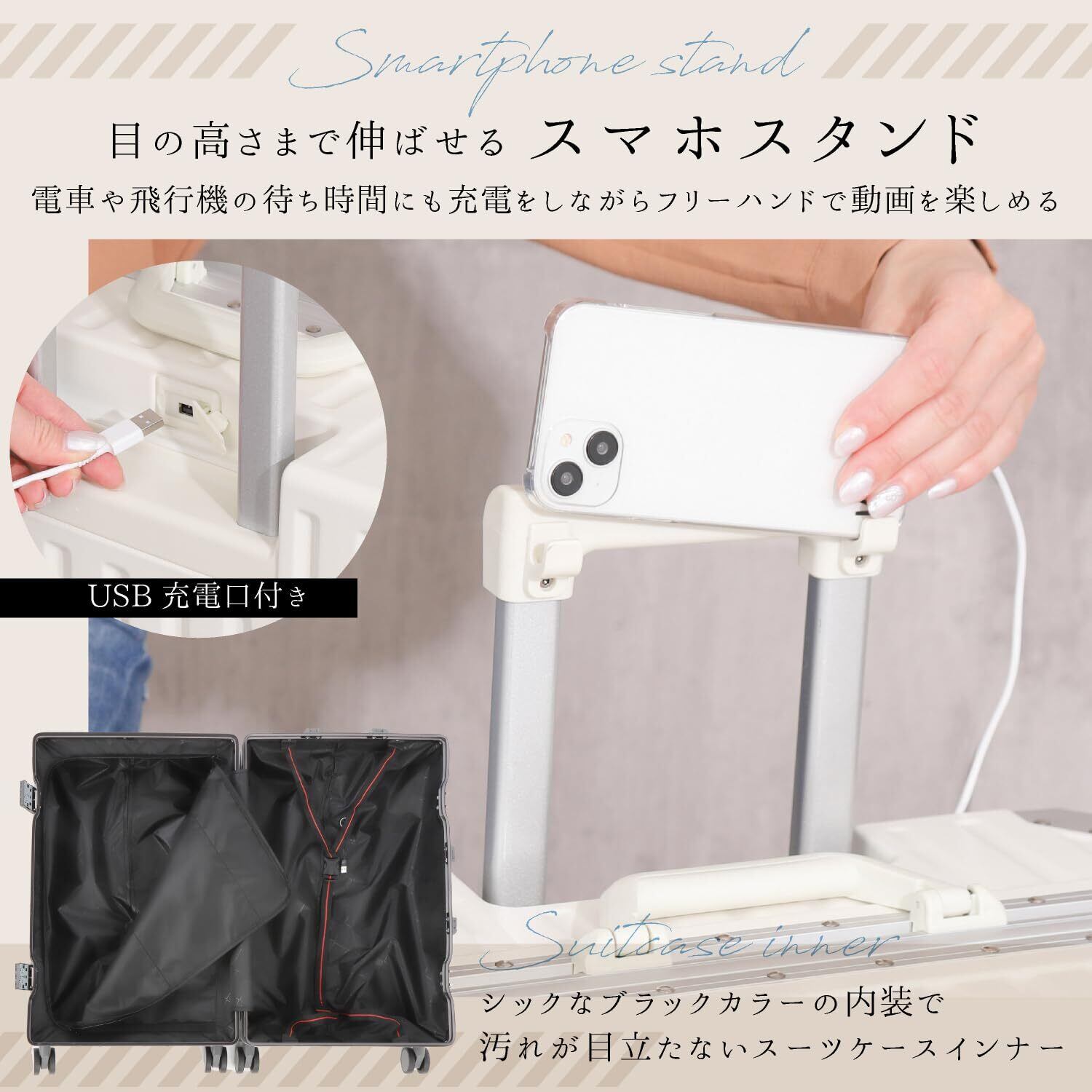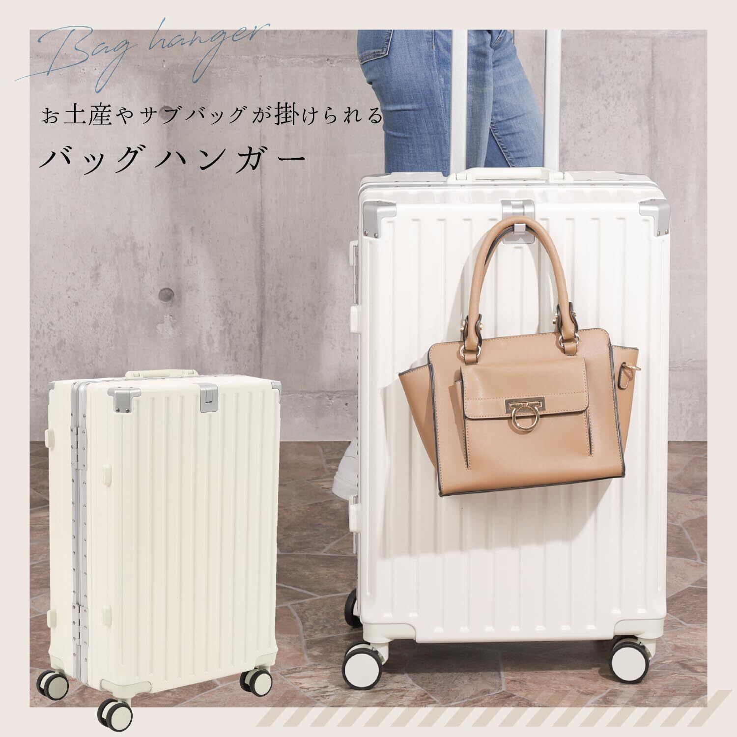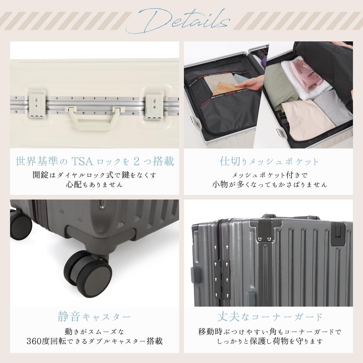 頑丈でありながら軽量なスーツケース】高級感あふれるアルミフレームと縦縞デザインで、飽きのこないデザイン性でおしゃれなサイズのスーツケースです。軽量設計で、女性でもらくらく持ち運びできるので、階段や段差などの移動もスムーズに行えます。 【キャスターは静かに移動】アルミ製のハンドルは伸縮調節が可能、身長に合わせて持ちやすい高さをキープ。自由自在に動くキャスターは静穏性が高く、街中やマンションの廊下でもゴロゴロ音が気になりません。丈夫なABS素材で、耐衝撃性に優れています。 【自由自在にパッキング】高品質のポリエステル生地で柔らかく、メッシュポケットで効率的に仕分け収納。収納グッズやポーチ、小物入れを使う方、着替えやお土産をたくさん詰めたい方におすすめ。ベルトが付いているので、荷物崩れを防ぎます。 【TSAダイヤルロック式で簡単施錠】TSAロック設定の説明書付。鍵紛失の心配がないダイヤル3桁をセットするロック式。(鍵穴がありますが、税関検査用の鍵穴でありお客様用の鍵はございません。)旅行先で鍵を失くす心配がありません。3泊~6泊のビジネスの出張や旅行におすすめのキャリーバッグで快適に過ごせます。 【商品詳細】カラー:ミルク / サイズ:Mサイズ ・外寸:約横39.5×奥行き24.5×高さ62cm /本体:約横37.5×奥行き24.5×高さ54.5cm / 容量:約50リットル / 重さ:約3.3kg / 宿泊 3泊~6泊(目安)※運送時などにできる多少のキズはお許しください。